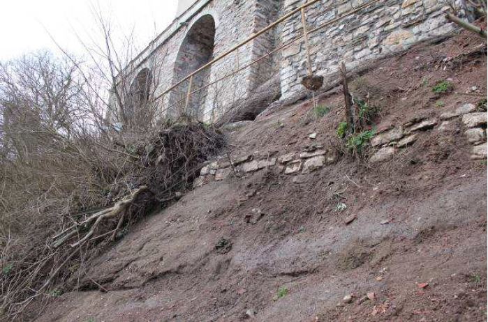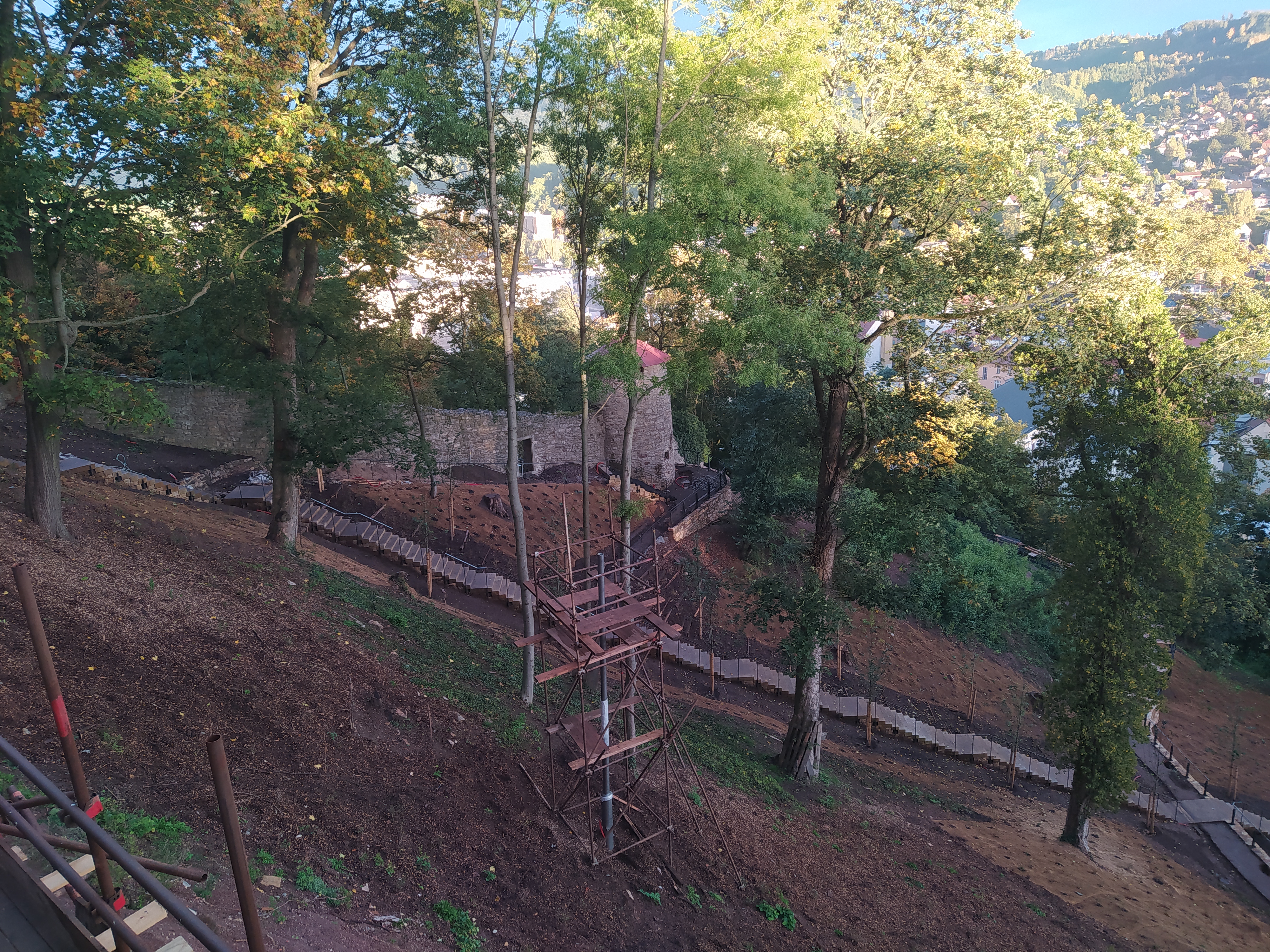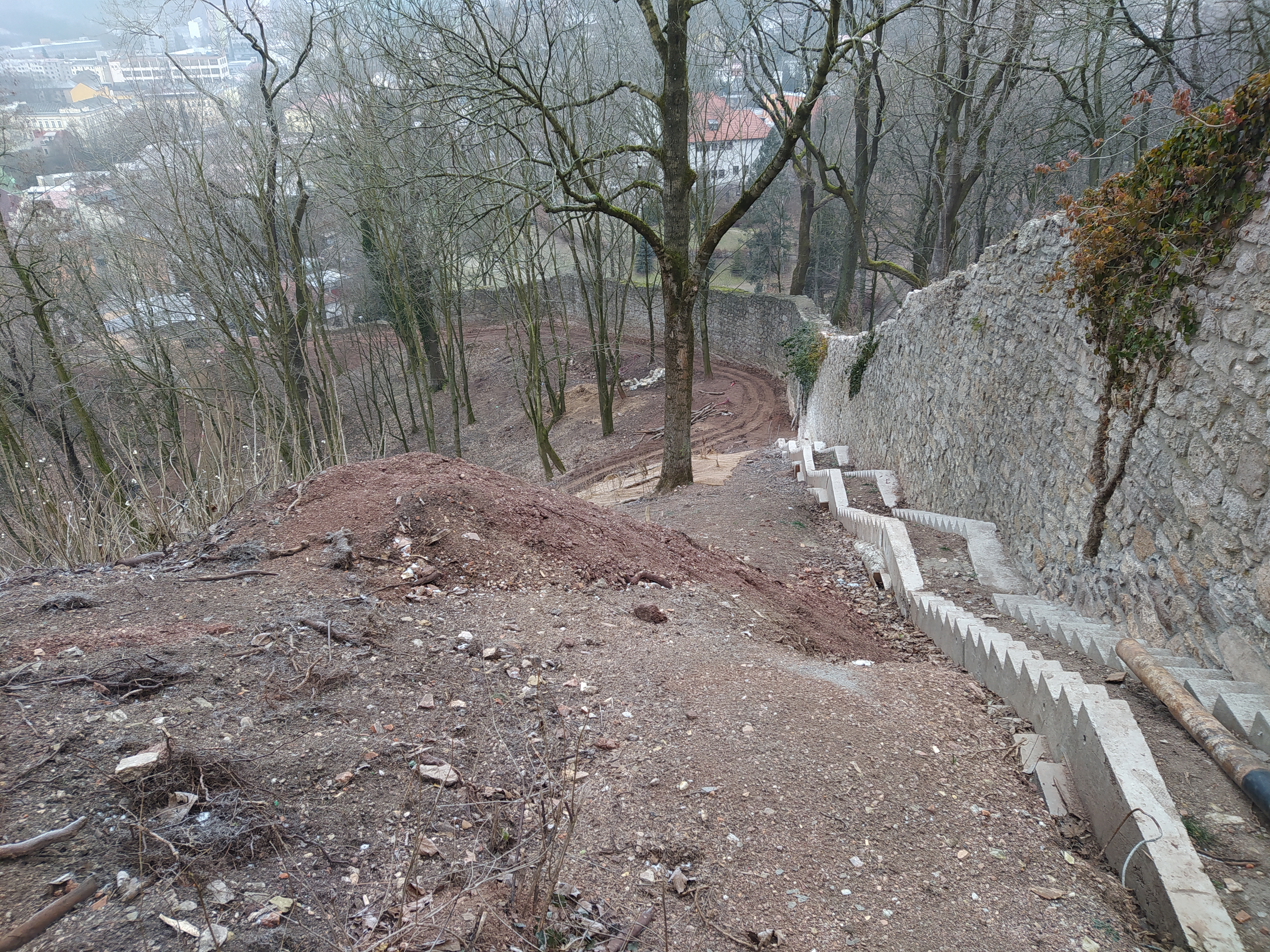 V souvislosti s výše uvedeným proběhly náročné práce v prudkém a skalnatém svahu při zakládání nových opěrných zdí a podpěr pro budoucí ocelové lávky.