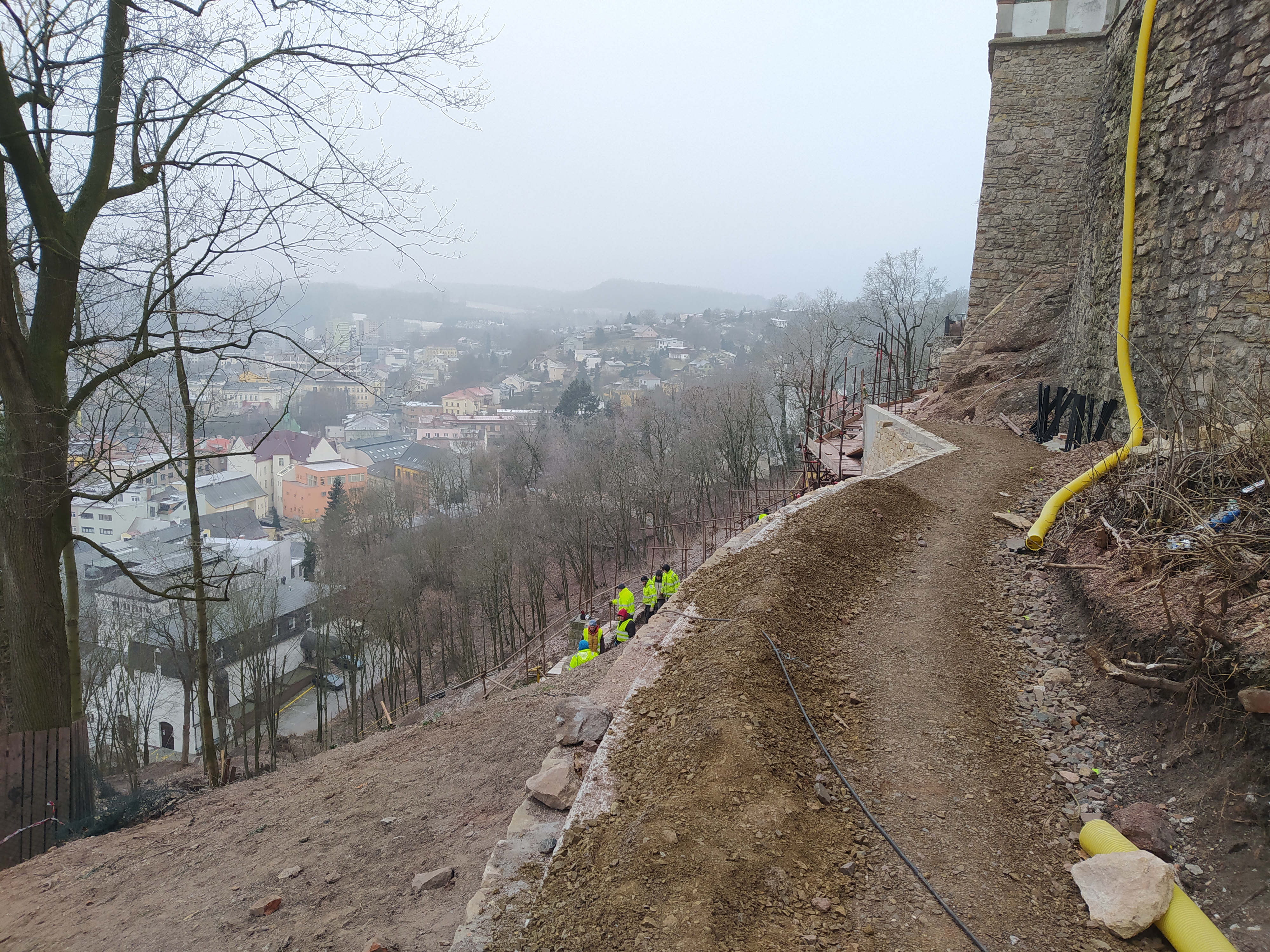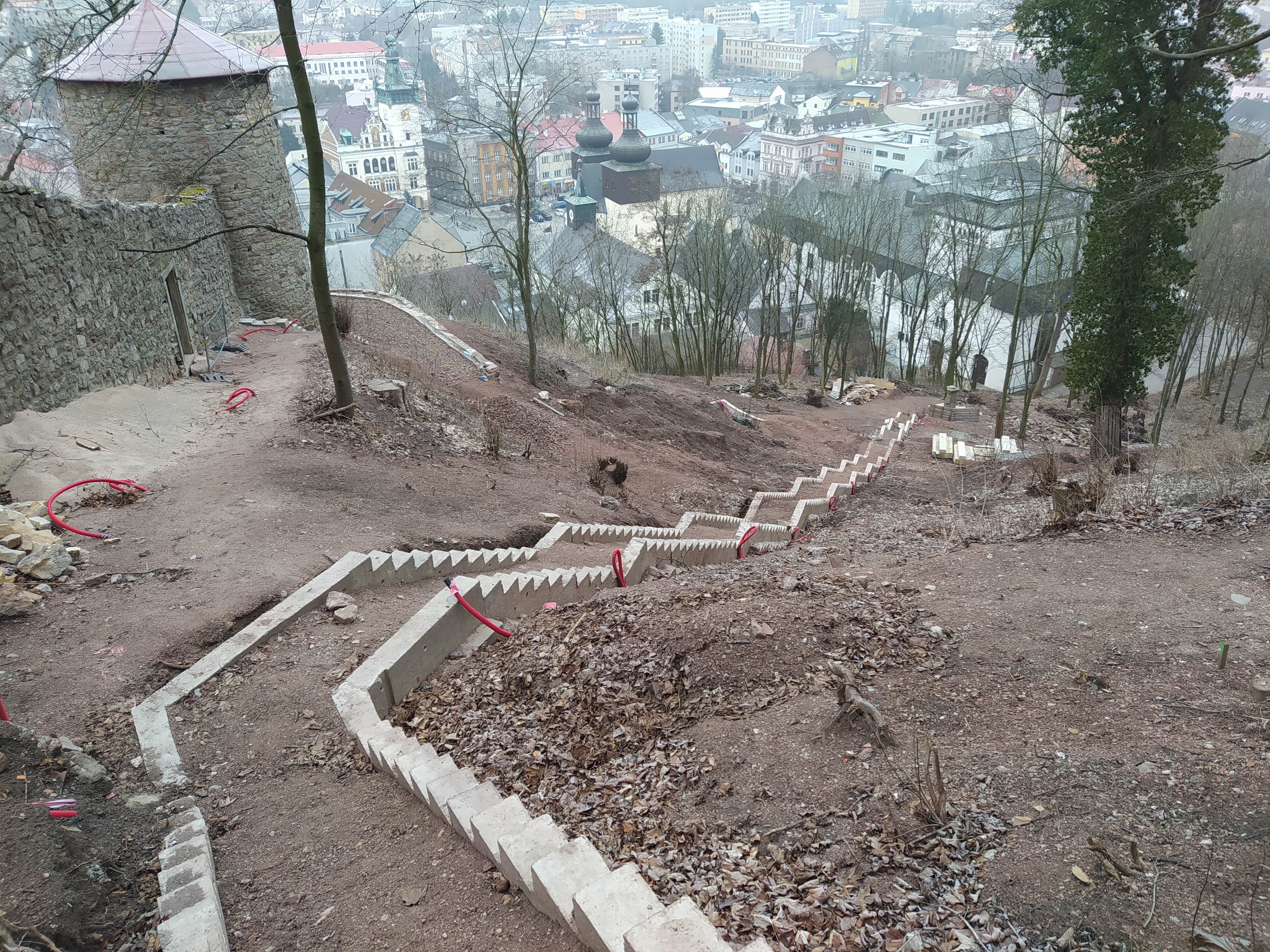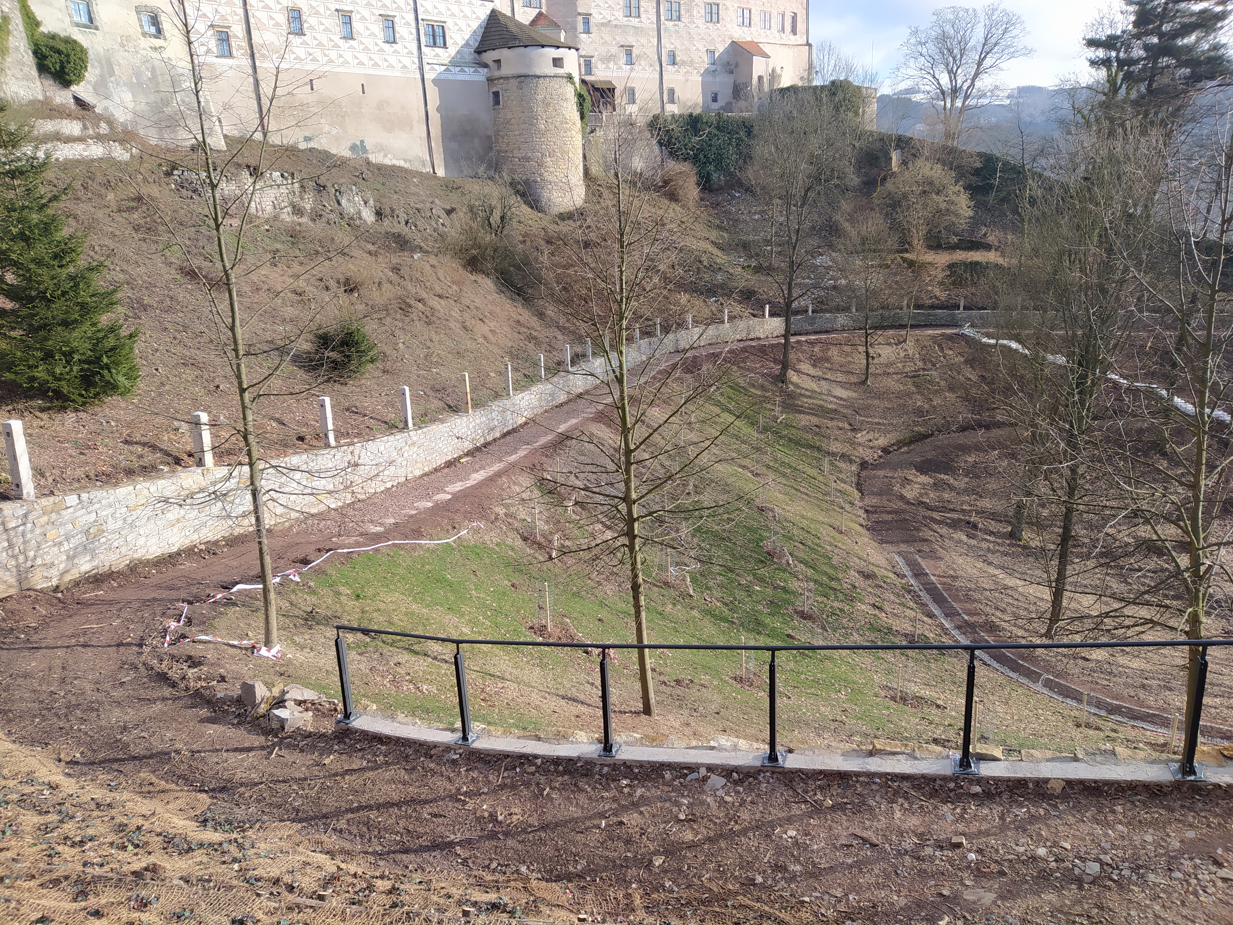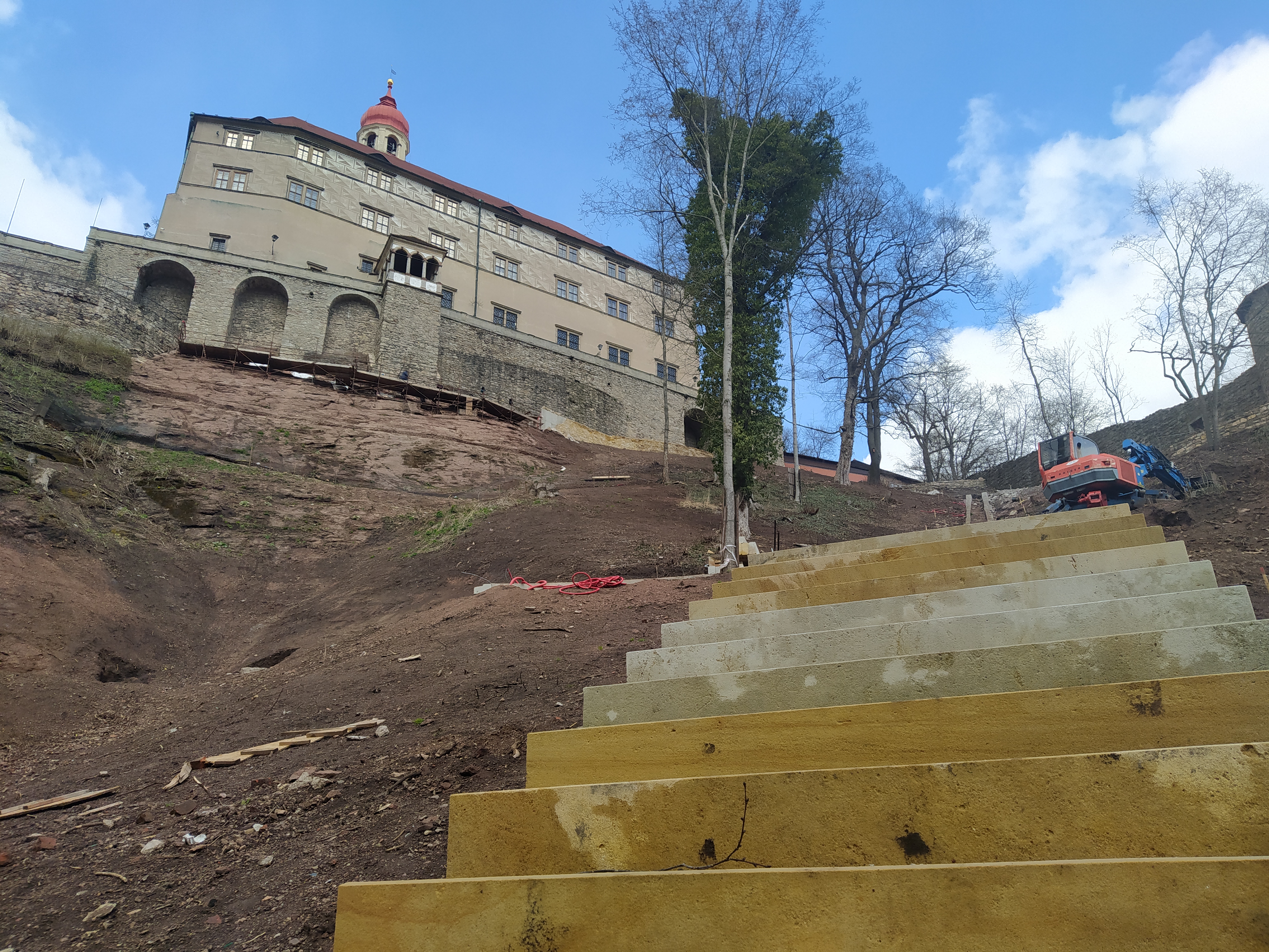 Na celém zámeckém kopci již byly dokončeny hlavní modulace terénů, veškeré základové konstrukce nově montovaných ocelových schodišť i lávek. V současné době probíhá montáž veškerých zámečnických prvků (ocelových lávek, schodišť a zábradlí).