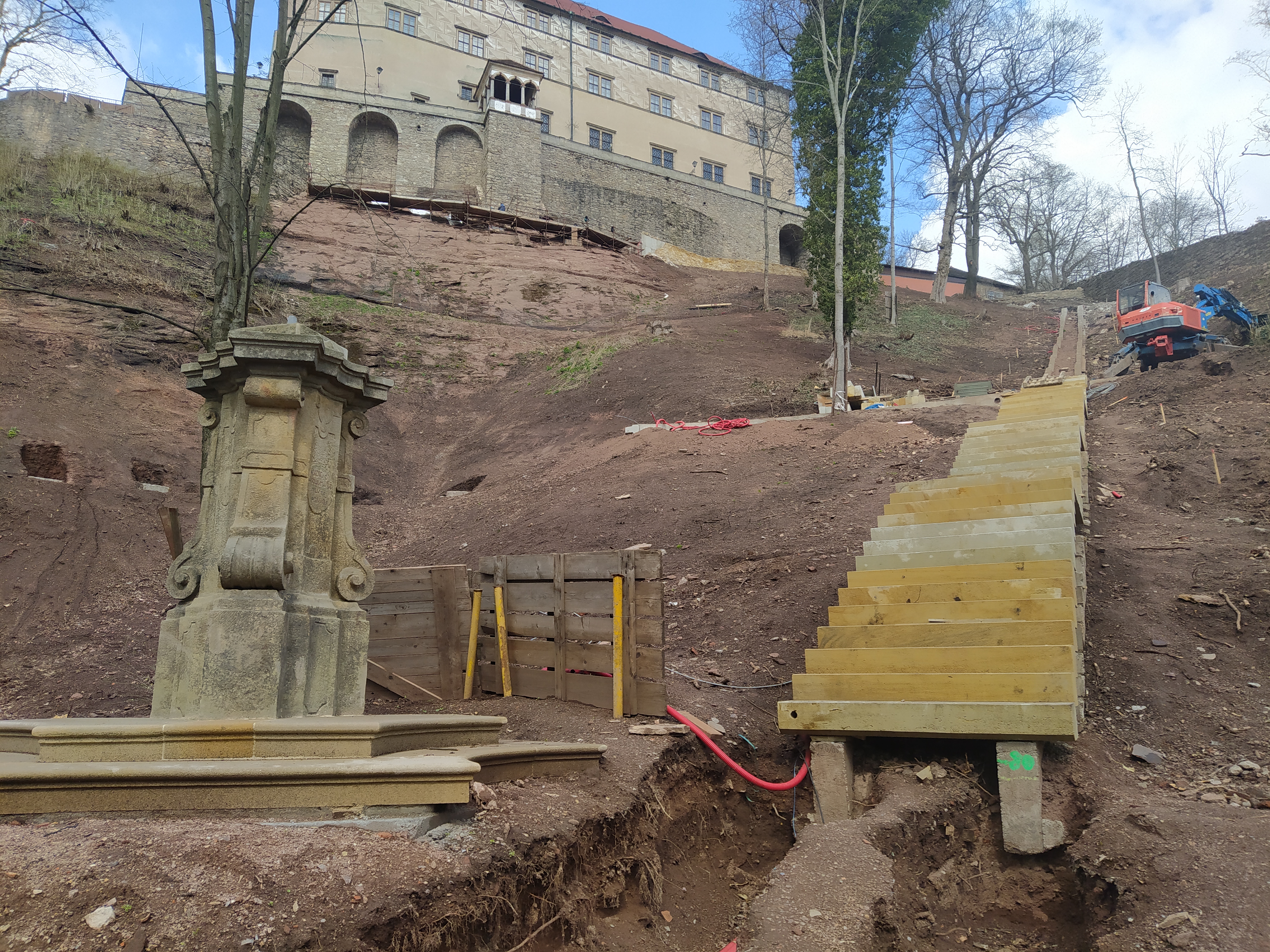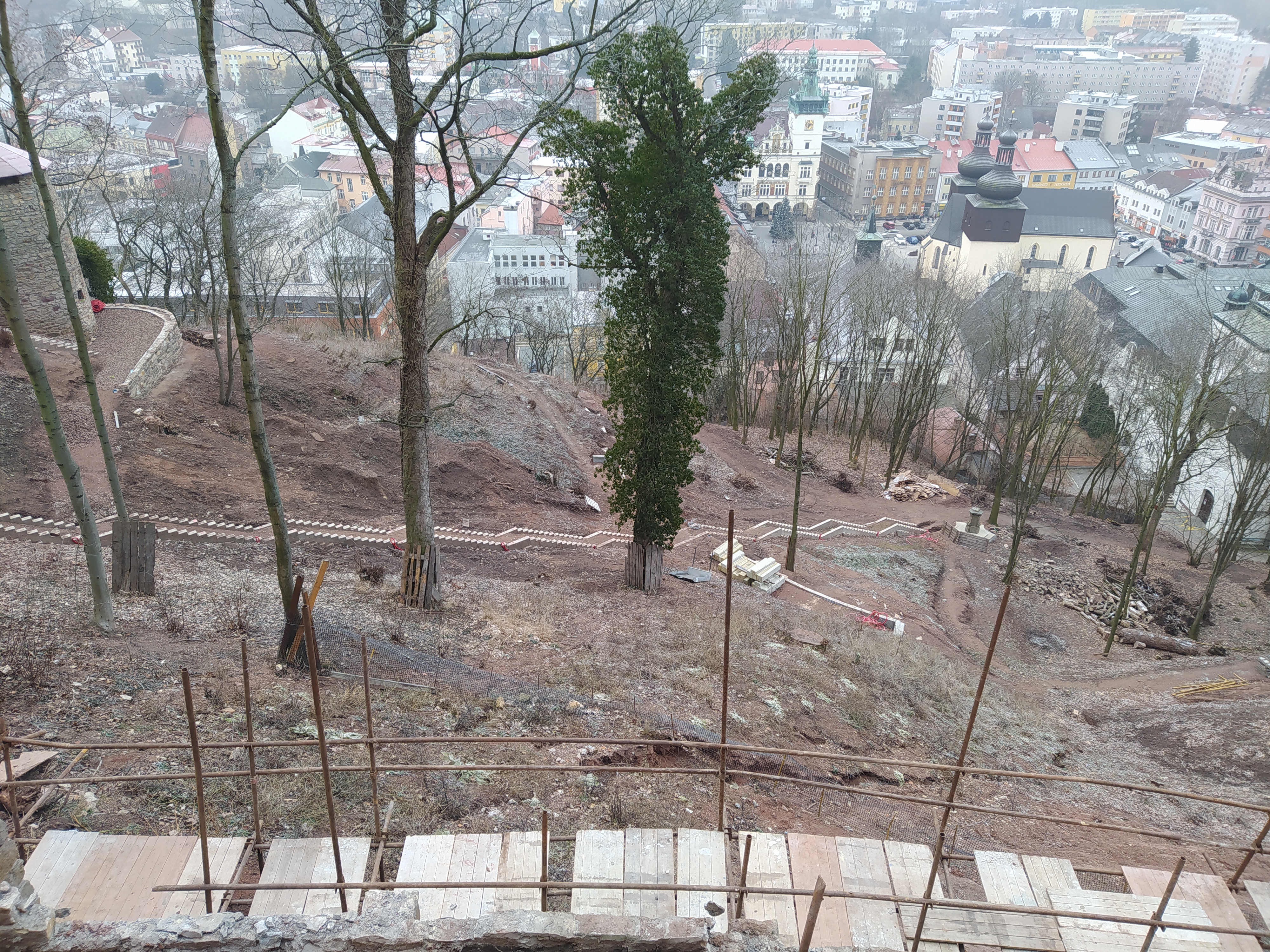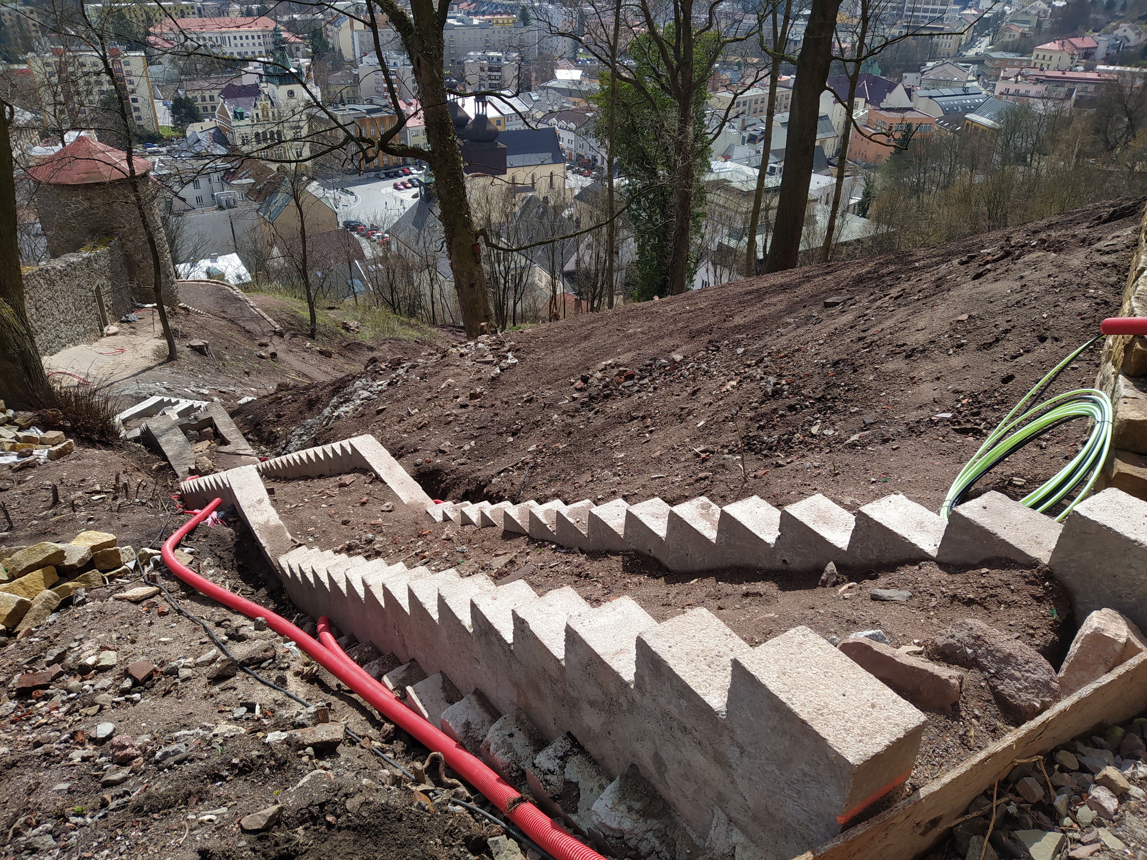Na celém zámeckém kopci již byly dokončeny hlavní modulace terénů, veškeré základové konstrukce nově montovaných ocelových schodišť i lávek. V současné době probíhá montáž veškerých zámečnických prvků (ocelových lávek, schodišť a zábradlí).