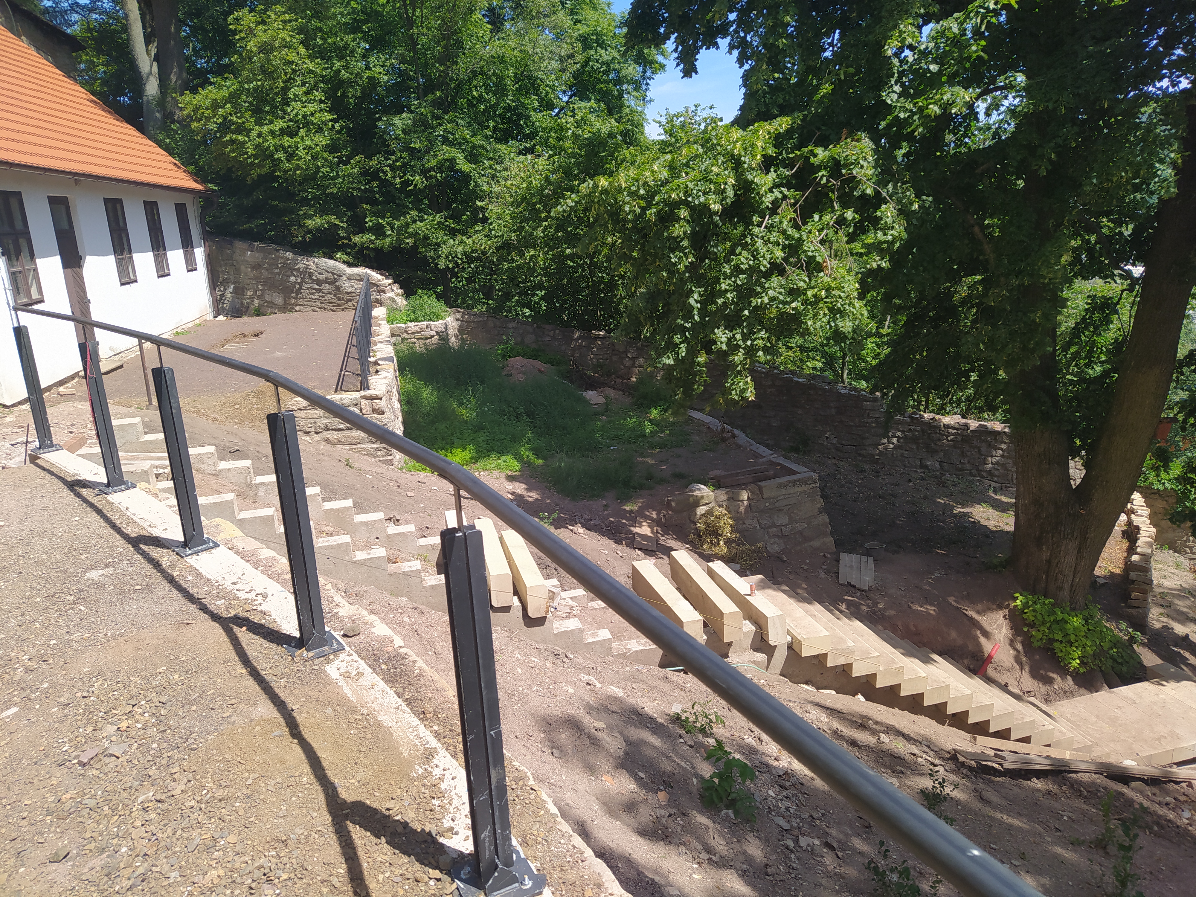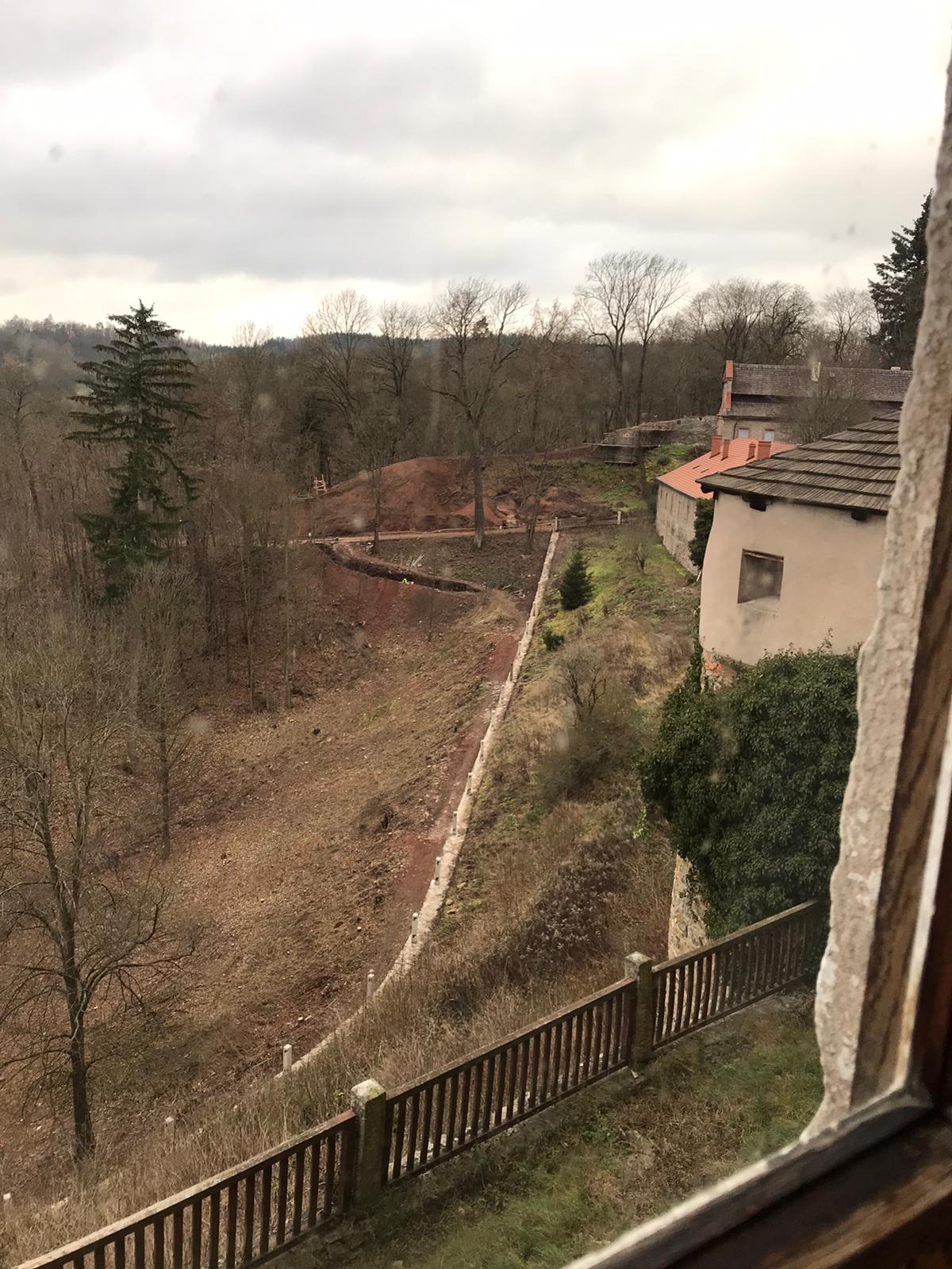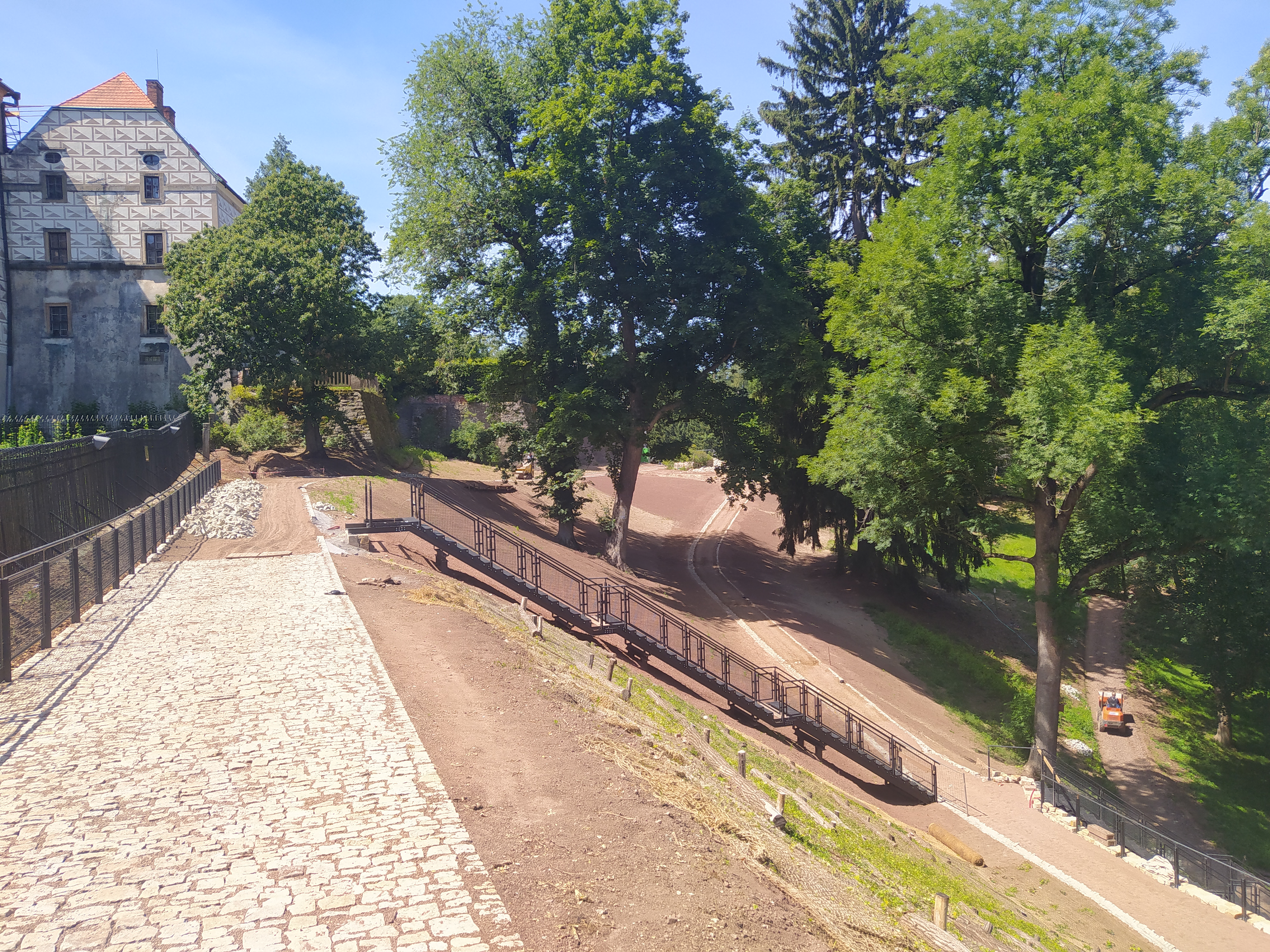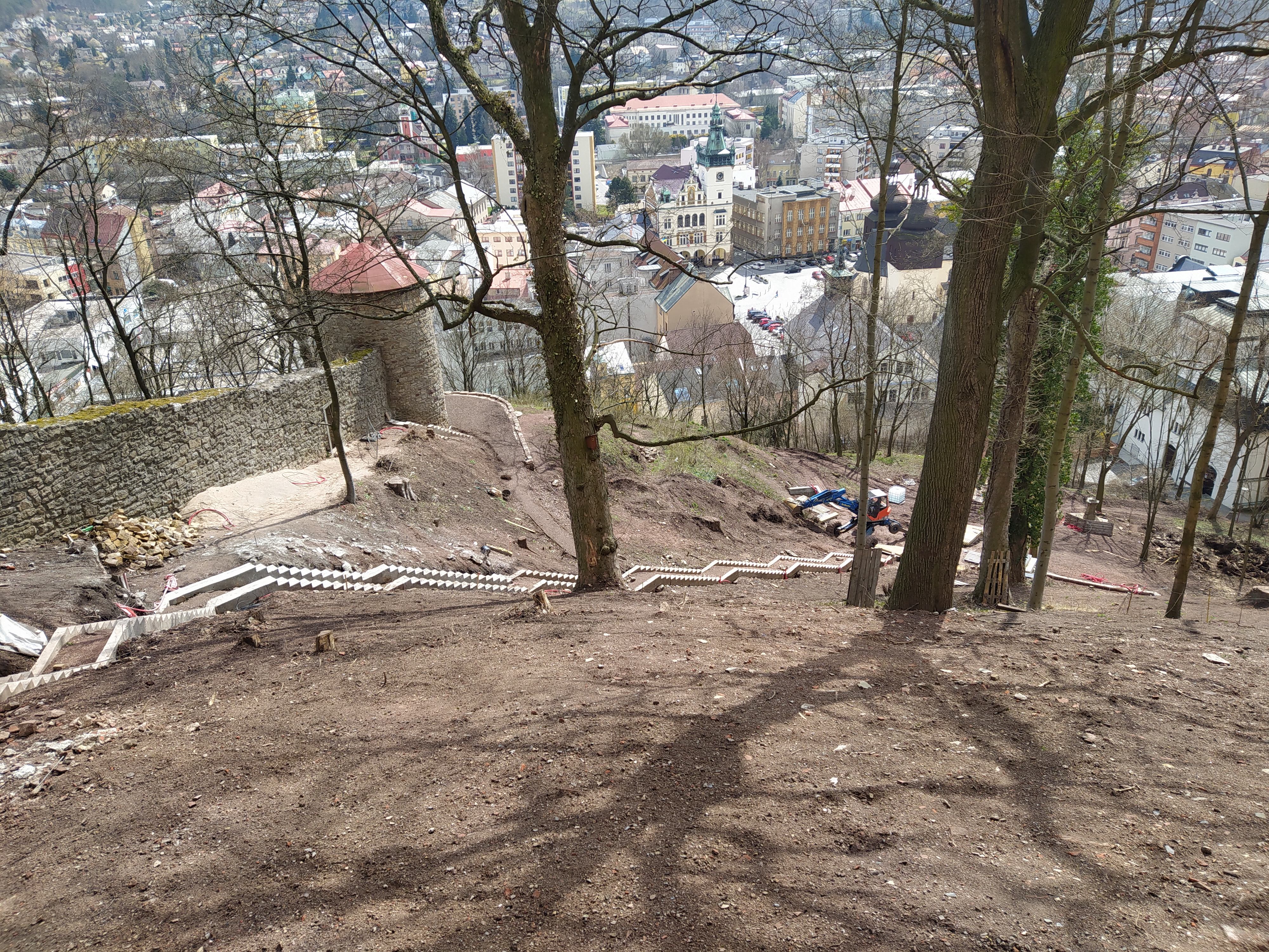 Na celém zámeckém kopci již byly dokončeny hlavní modulace terénů, veškeré základové konstrukce nově montovaných ocelových schodišť i lávek. V současné době probíhá montáž veškerých zámečnických prvků (ocelových lávek, schodišť a zábradlí).