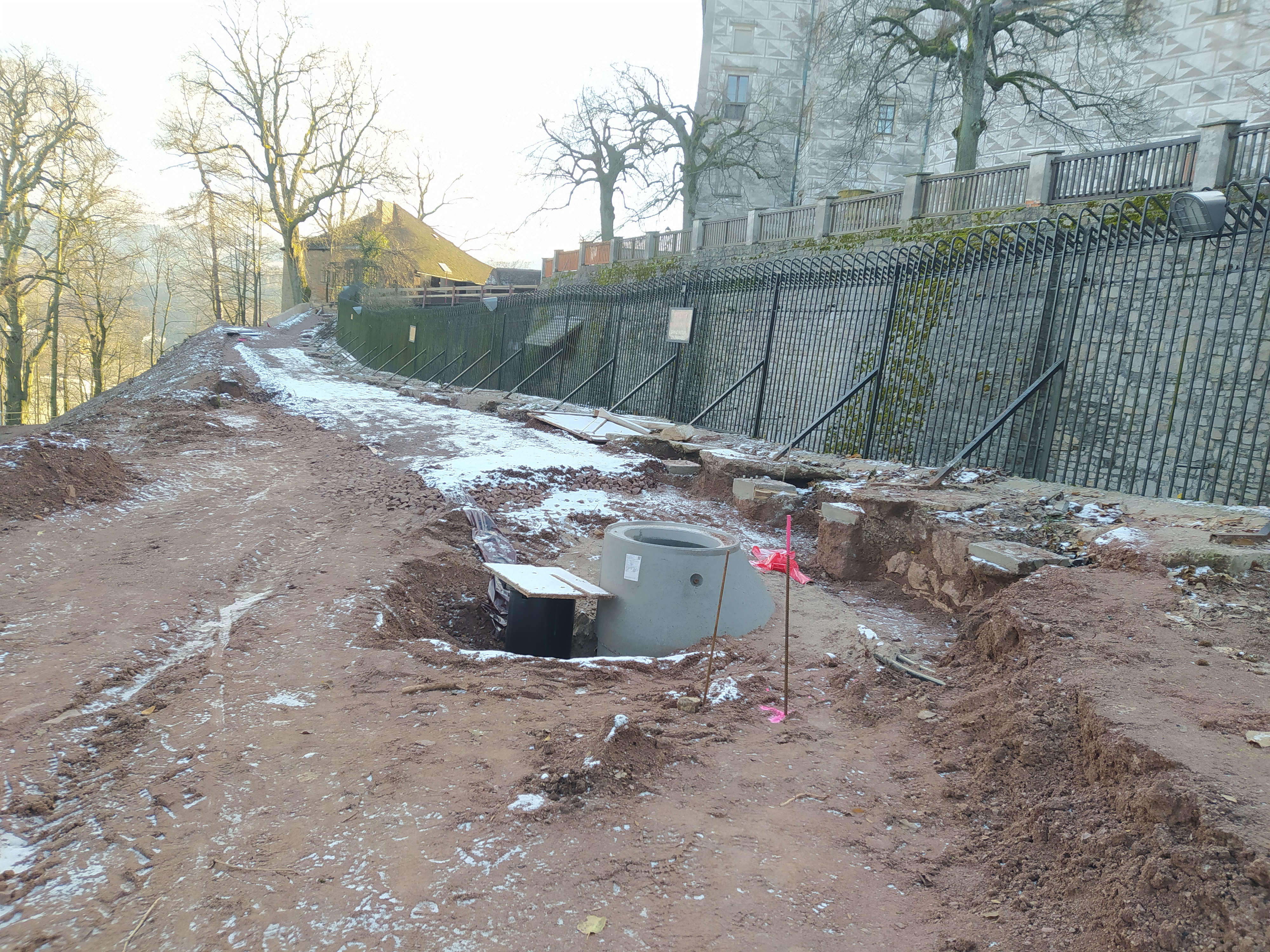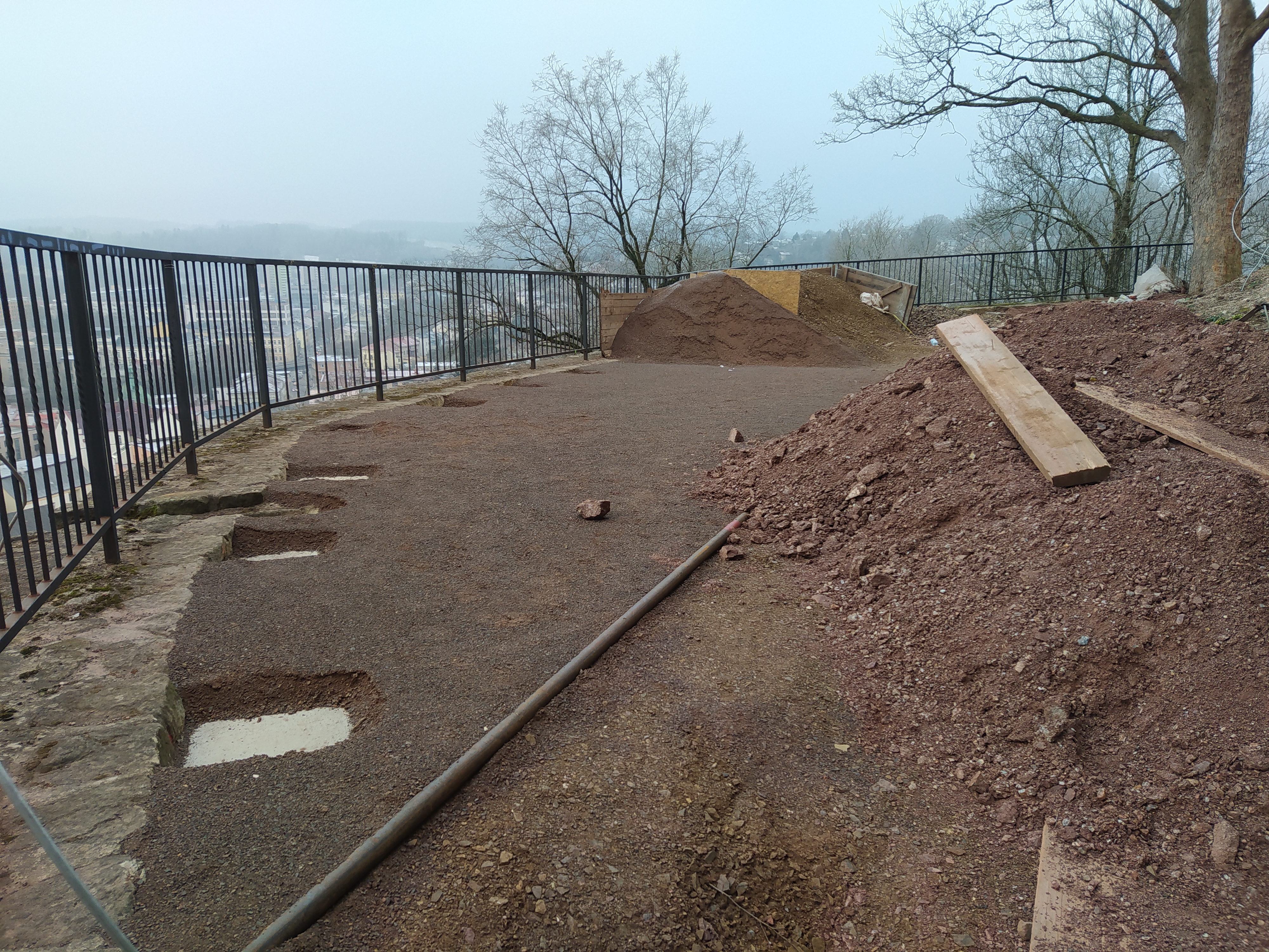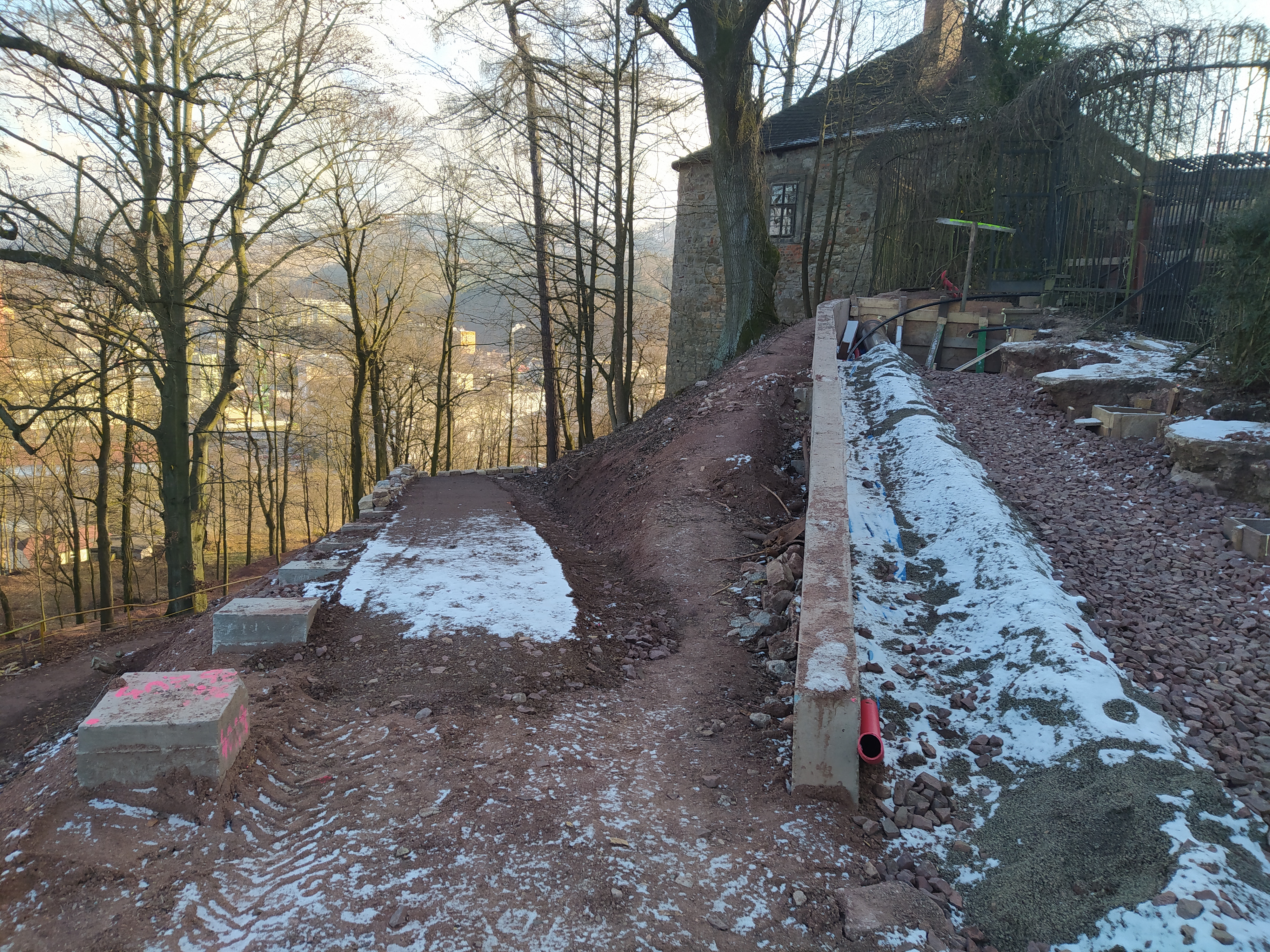 Vzhledem k aktuálním klimatickým podmínkám byly již koncem minulého roku pozastaveny práce, pro jejichž provádění je aktuální počasí nevhodné (např. zdění a obkládání z kamenných prvků, betonáže). Jen díky tomuto kroku lze zachovat kvalitu prováděných prací a dosáhnout co nejdelší životnosti. Jakmile dojde ke zlepšení klimatických podmínek, budou tyto stavební práce zahájeny. Jedná se např. o základové konstrukce pro založení plánovaných schodišť a ocelových lávek. A právě zábradlí pro tyto uvedené konstrukce se nyní nachází ve výrobě.