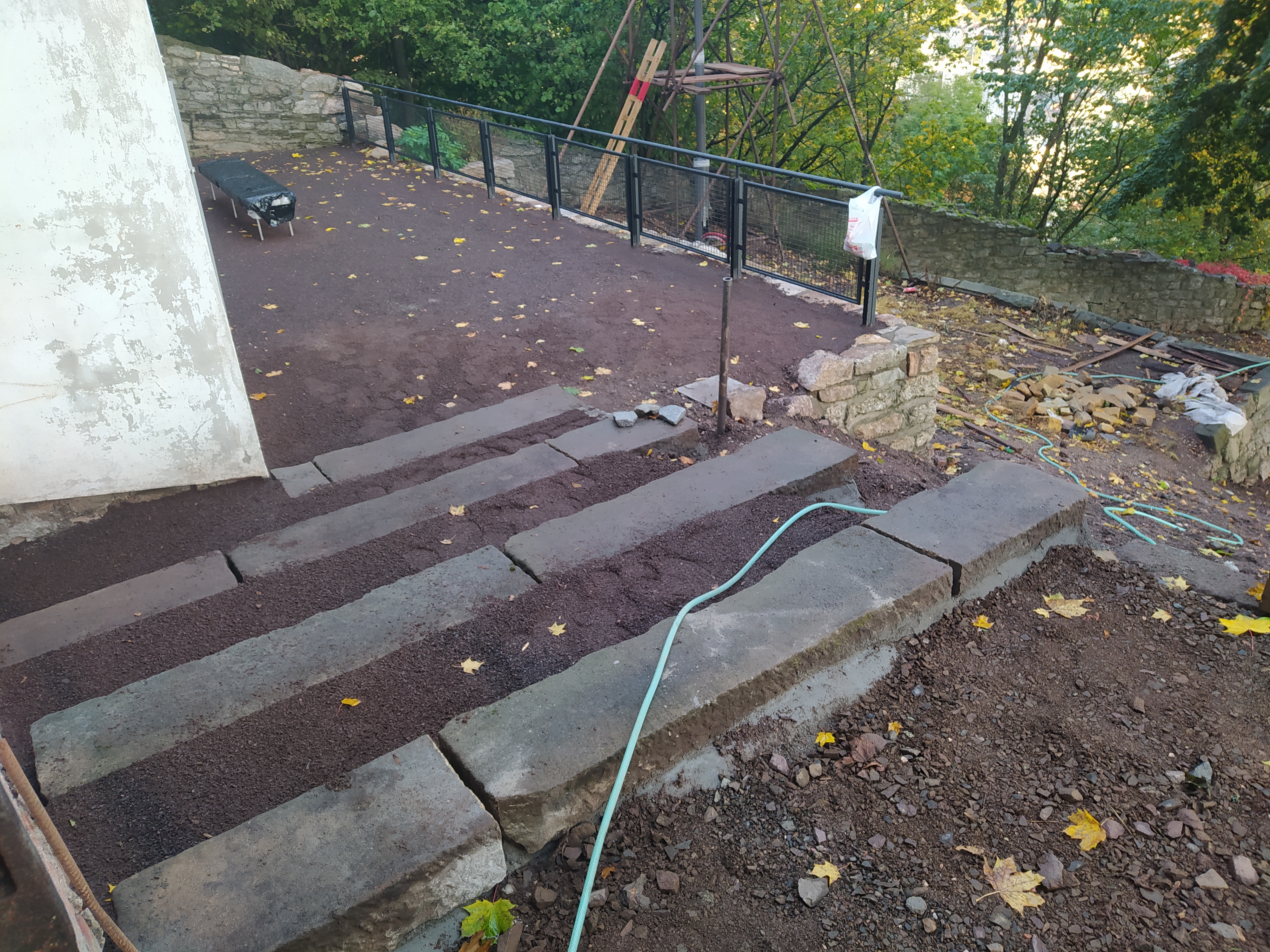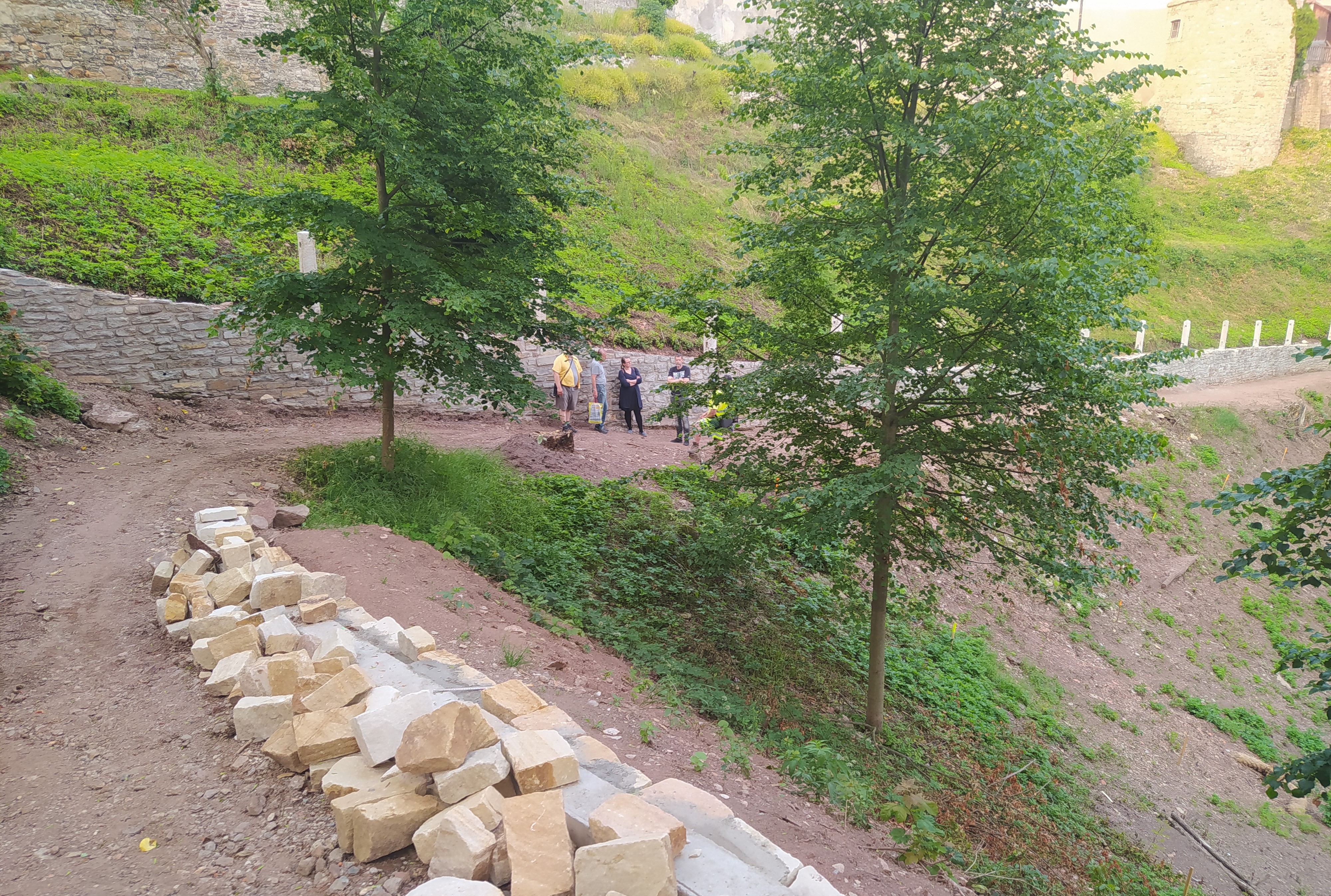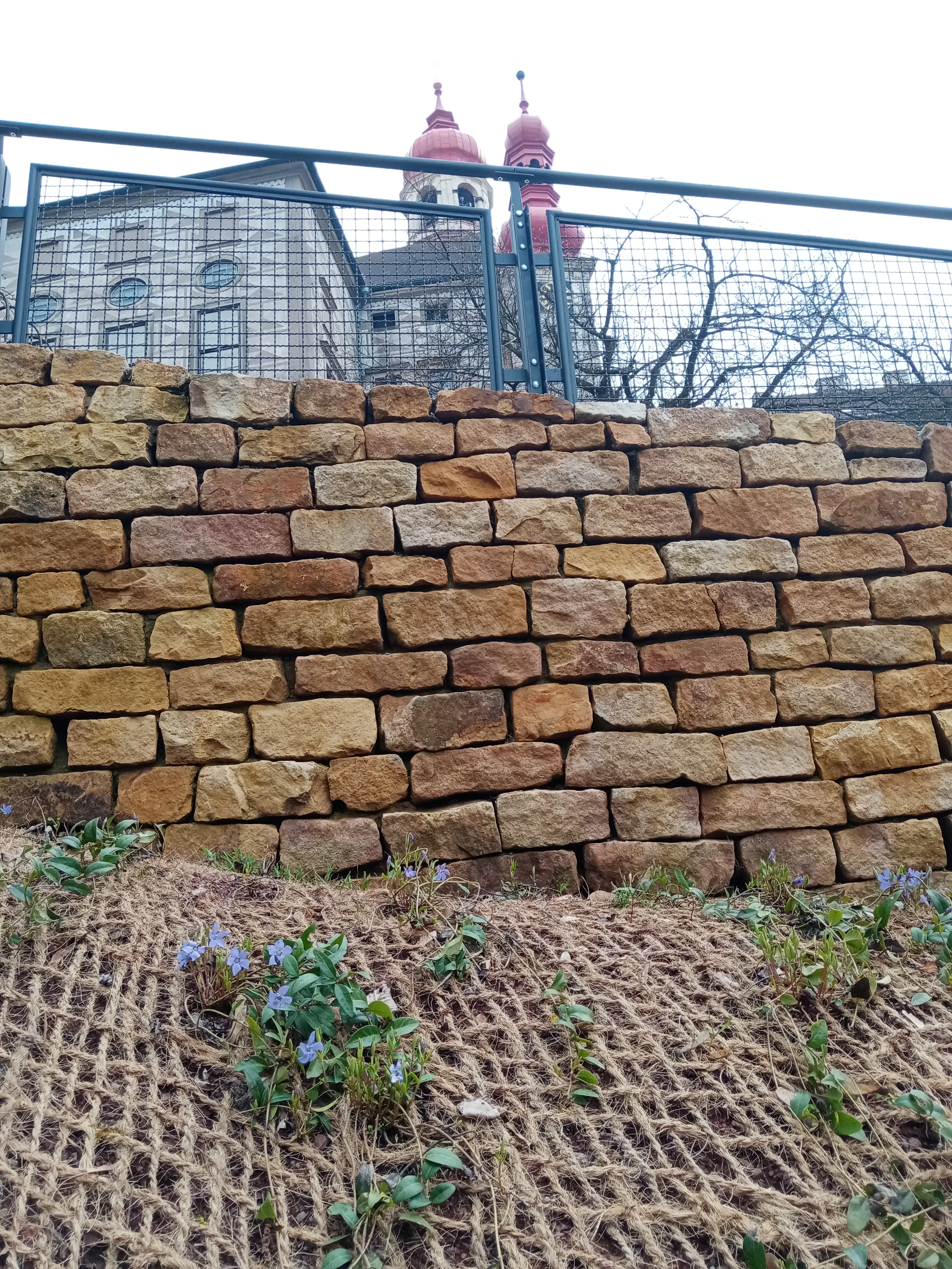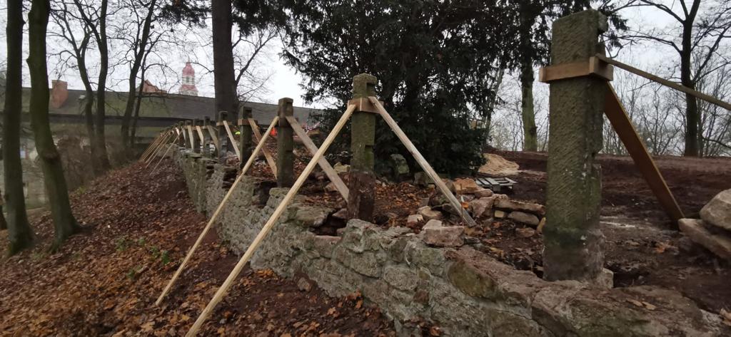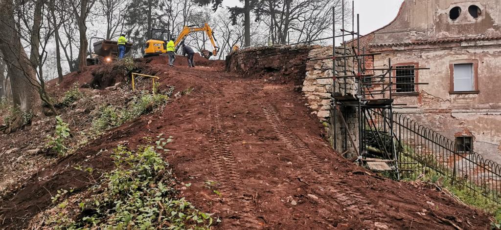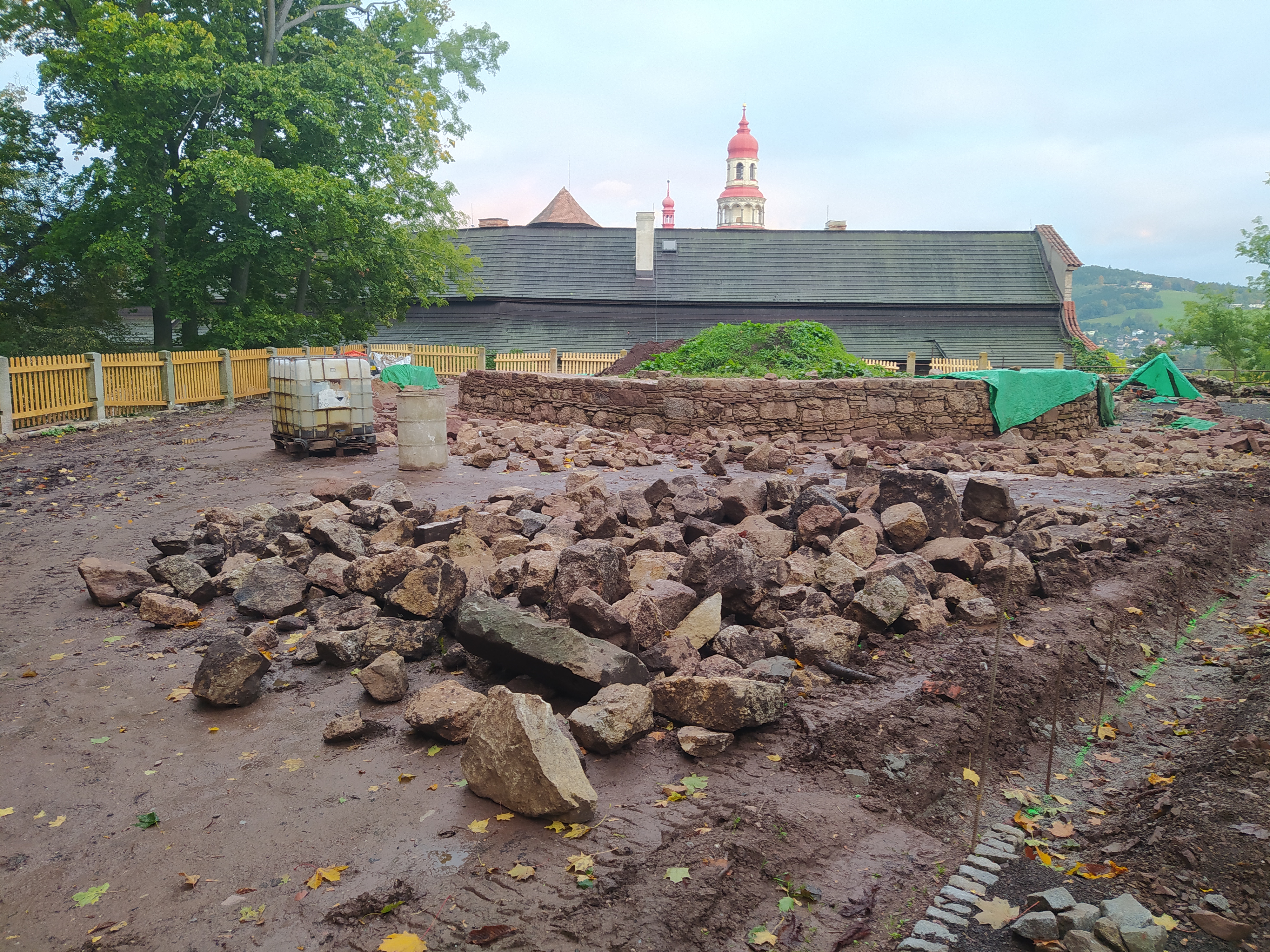 Došlo také k zahájení čištění, přezdívání a spárování stávajících opěrných kamenných zdí pod odborným dohledem zástupců památkové péče a zároveň byly vzorkovány a odsouhlasovány materiály pro jejich aplikaci v rámci této stavební činnosti (například výběr druhu a struktury kamene pro zdění nových opěrných zdí, schodišťových stupňů či kamenných sloupků, druh a složení zdících a spárovacích malt a podobně).