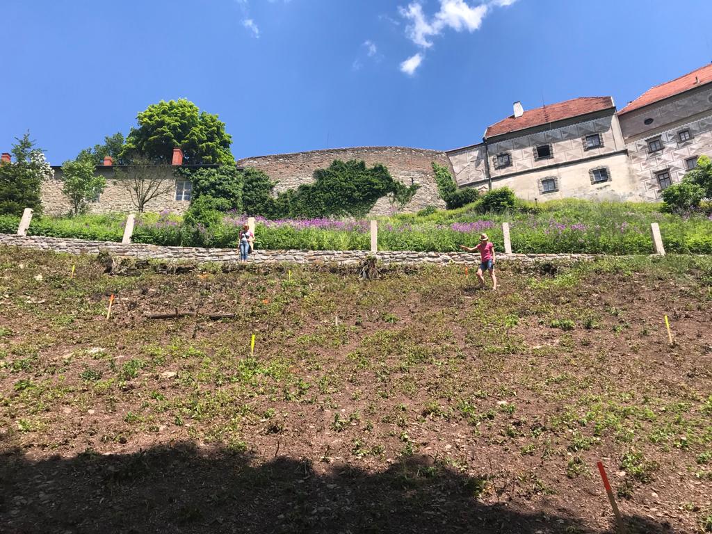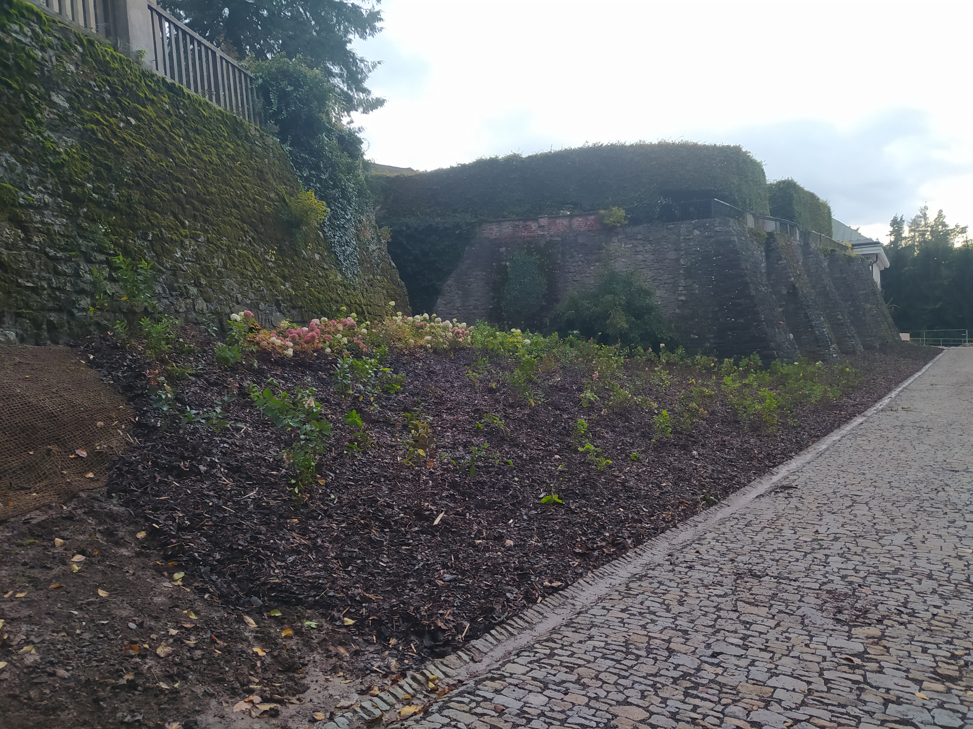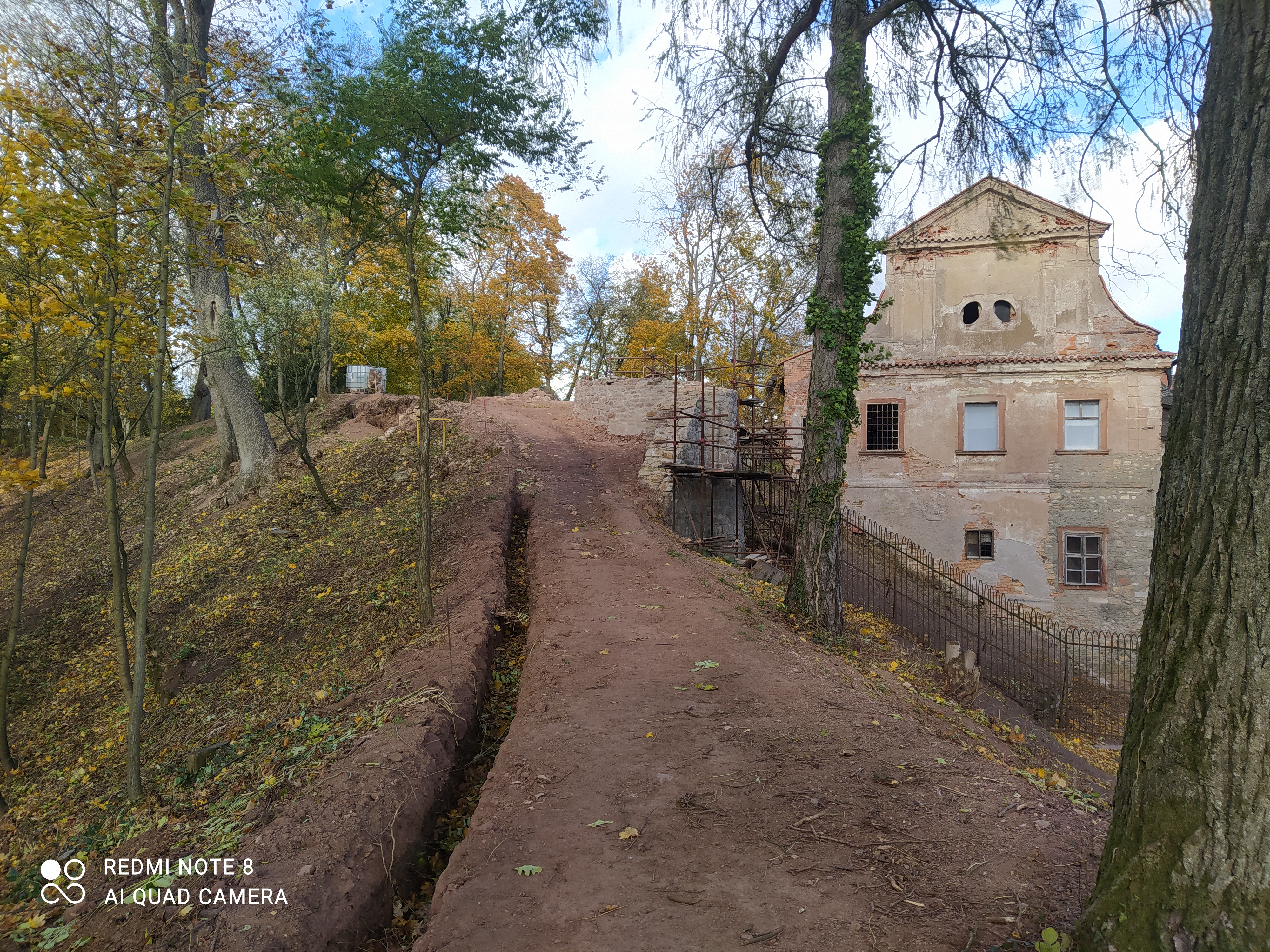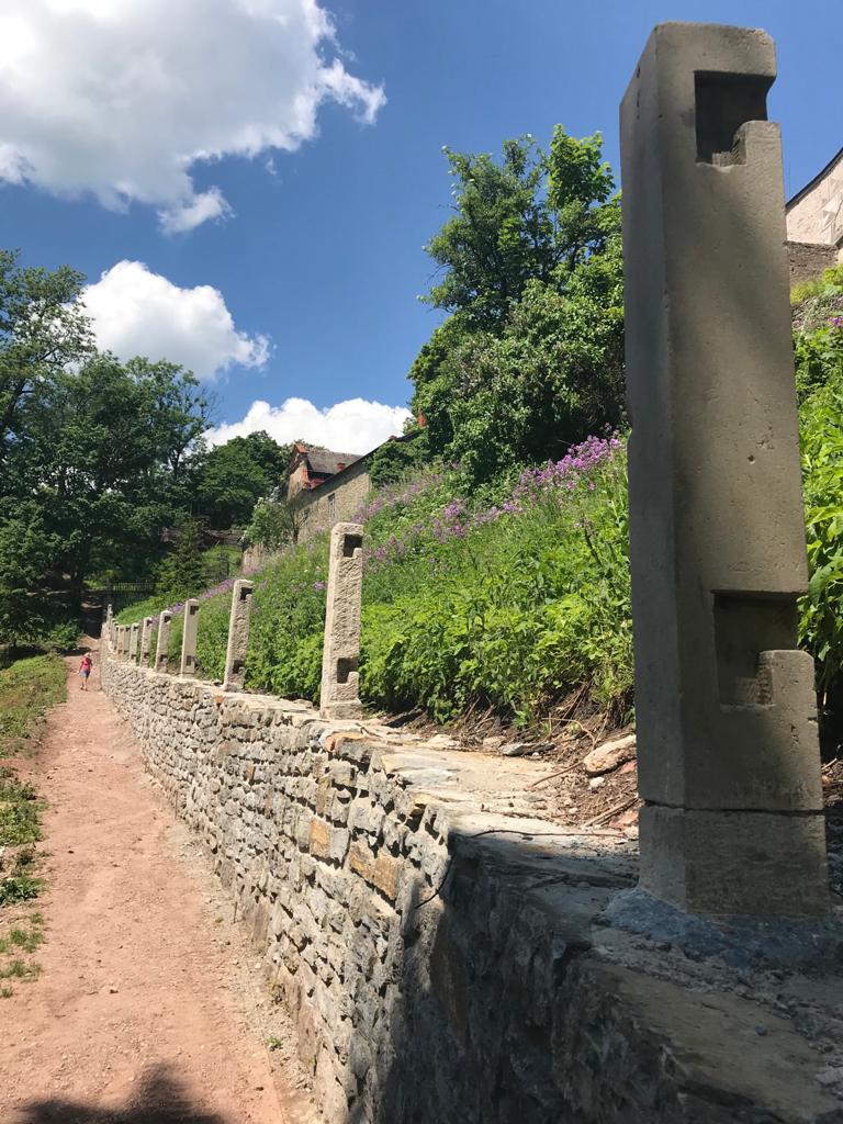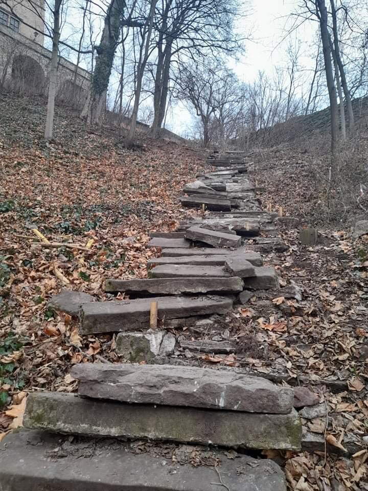 Došlo také k zahájení čištění, přezdívání a spárování stávajících opěrných kamenných zdí pod odborným dohledem zástupců památkové péče a zároveň byly vzorkovány a odsouhlasovány materiály pro jejich aplikaci v rámci této stavební činnosti (například výběr druhu a struktury kamene pro zdění nových opěrných zdí, schodišťových stupňů či kamenných sloupků, druh a složení zdících a spárovacích malt a podobně).