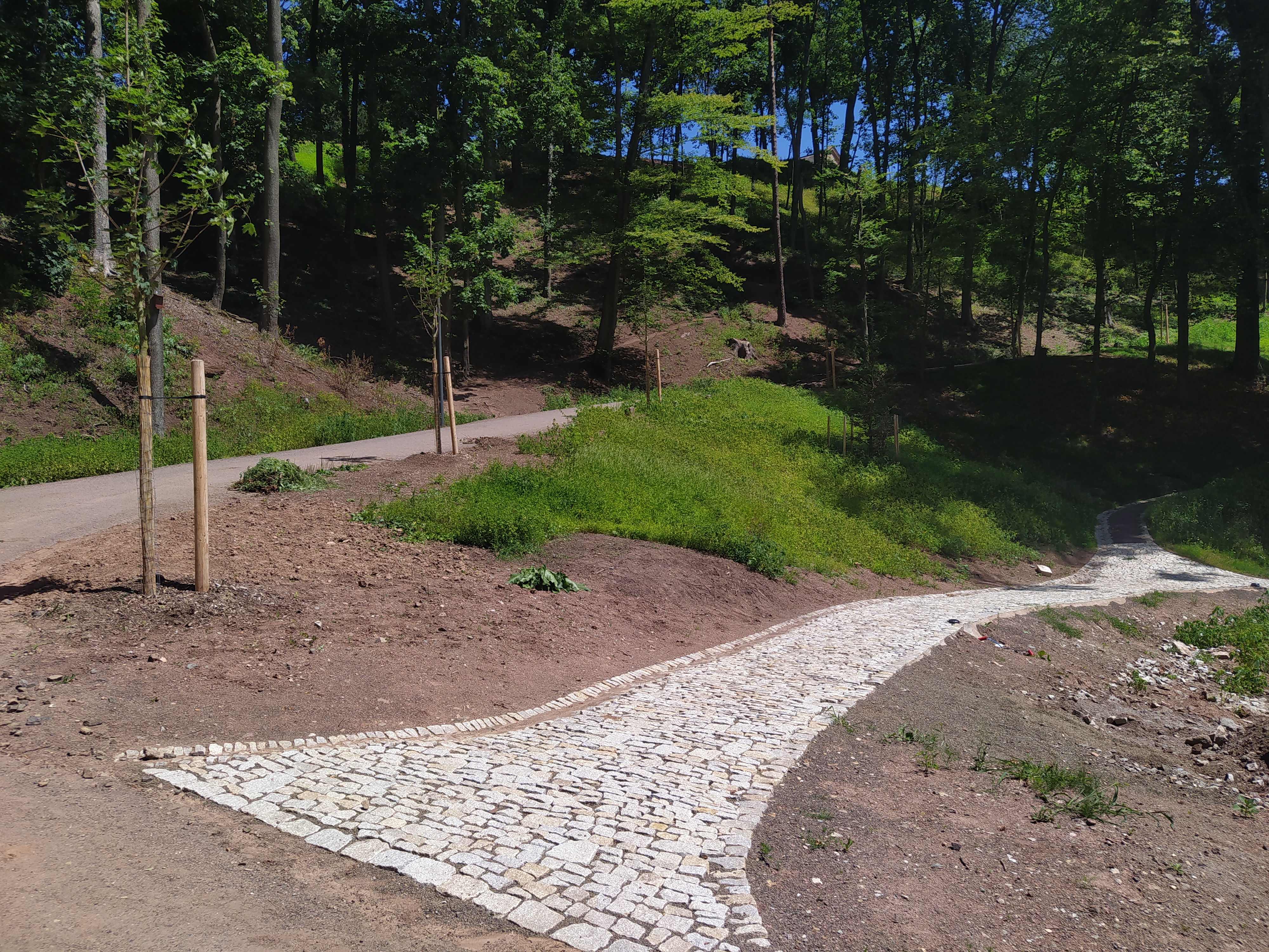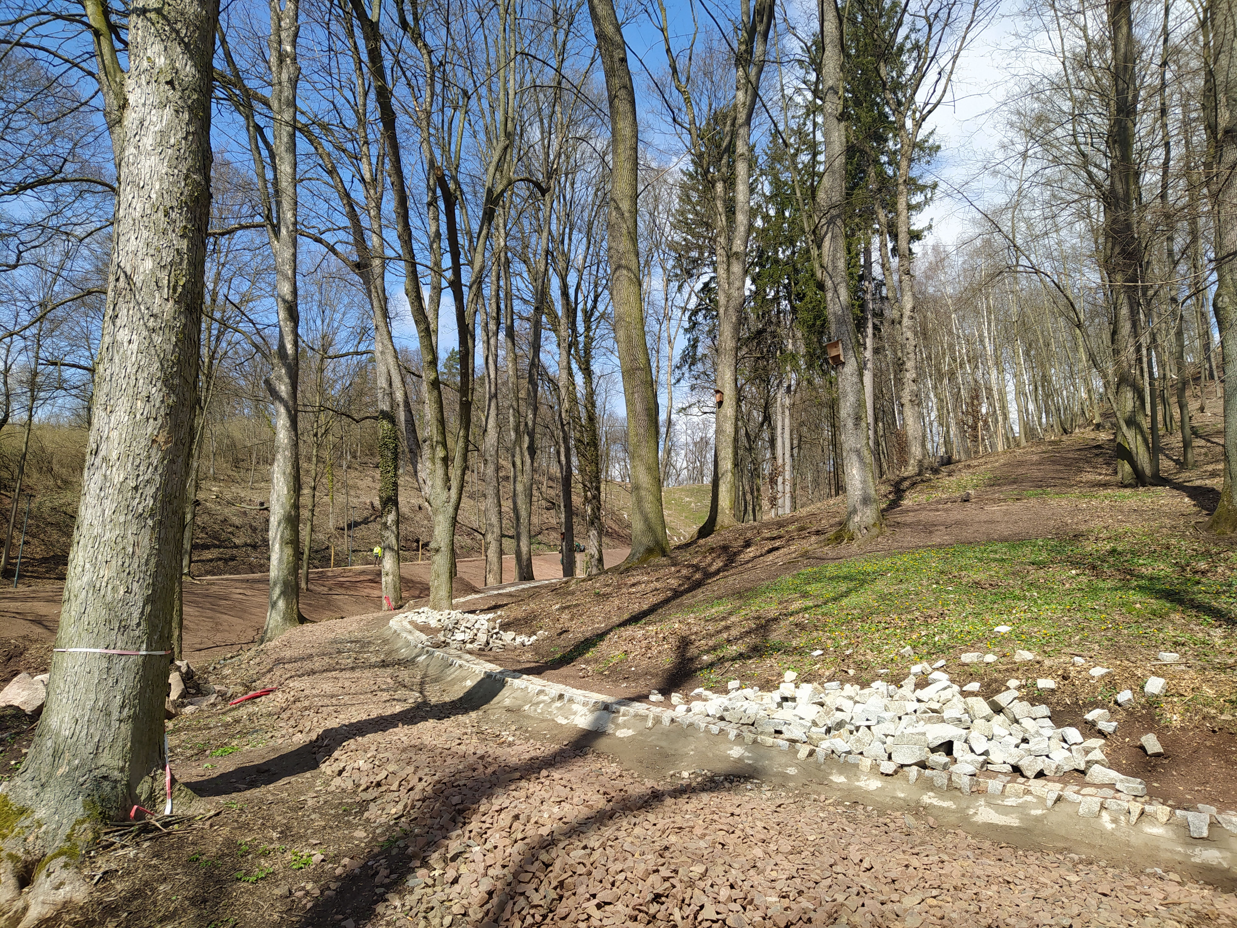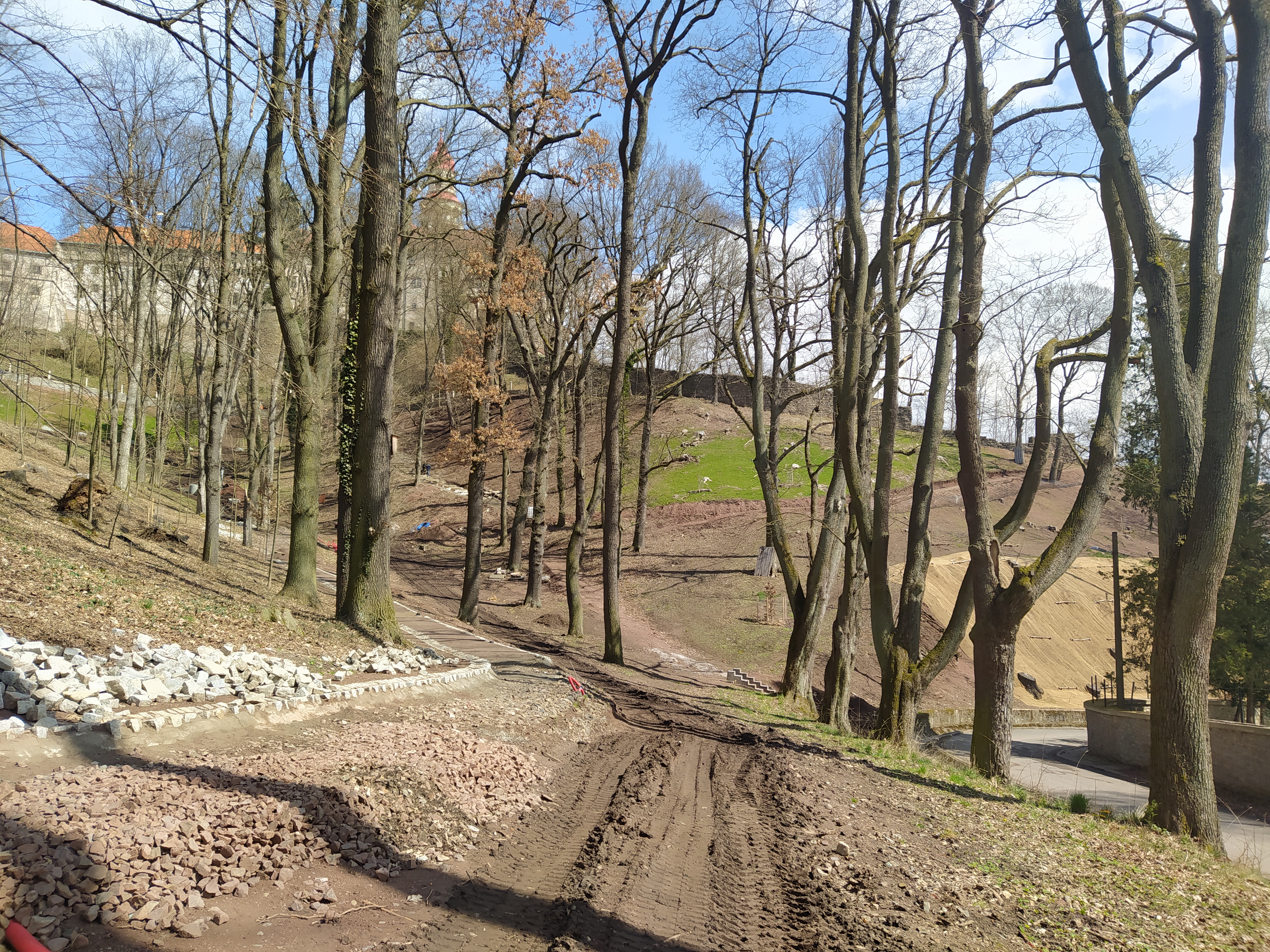 Stále probíhá modulace cest napříč zámeckým kopcem včetně úprav navazujícího terénu. Na cestách, které již byly upraveny, probíhá dláždění kamenných obrub a pokládka zemního souvrství (včetně infrastruktury – pro odvodnění a veřejné osvětlení) pro budoucí mlatové cesty. Probíhá i betonování a zdění opěrných zdí pro budoucí cesty v návaznosti na plánované ocelové lávky. Ty jsou spolu s ocelovými konstrukcemi schodišť v dílnách připravovány a vzorkovány. Bylo zahájeno osazování nových kamenných schodišť a zároveň jsou budována schodiště nová, jež budou osazena původními kamennými stupni.