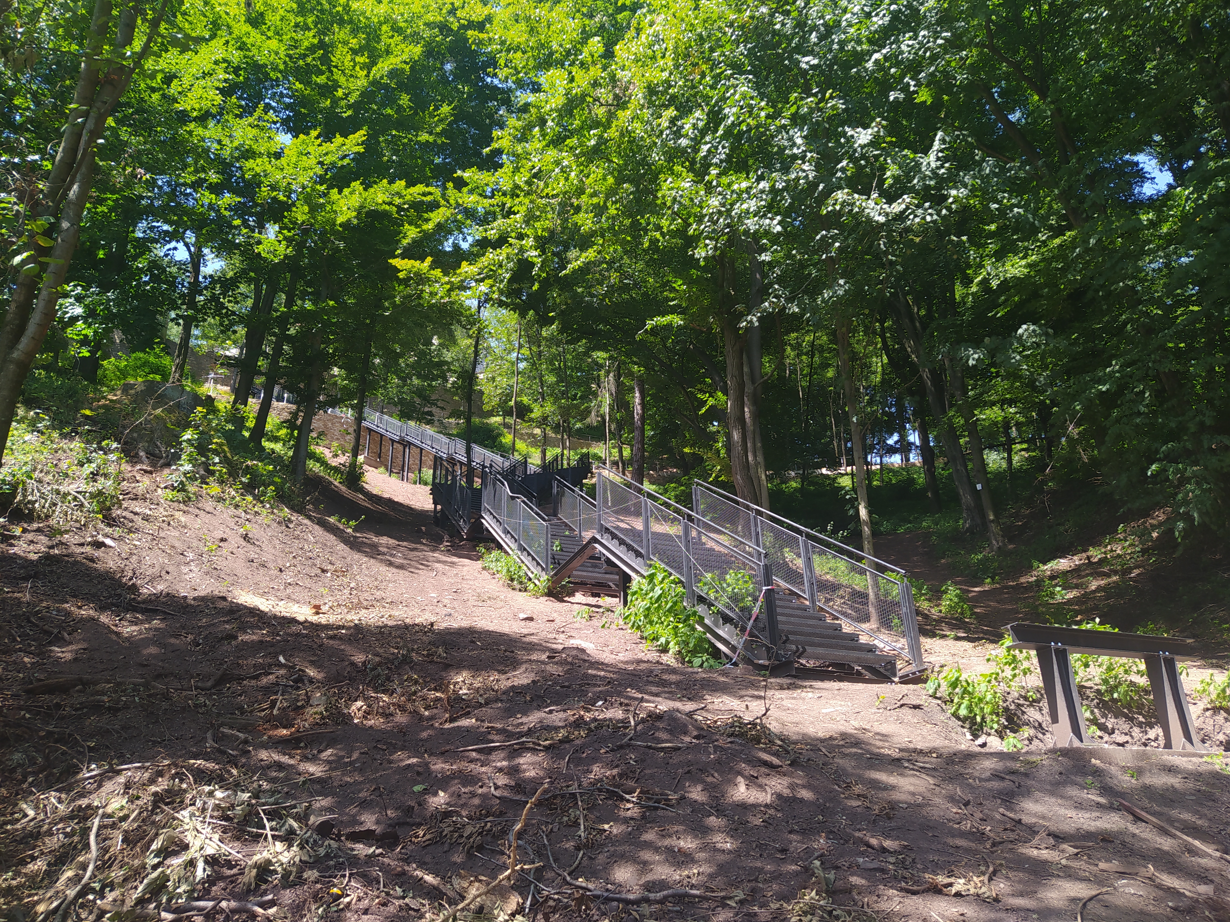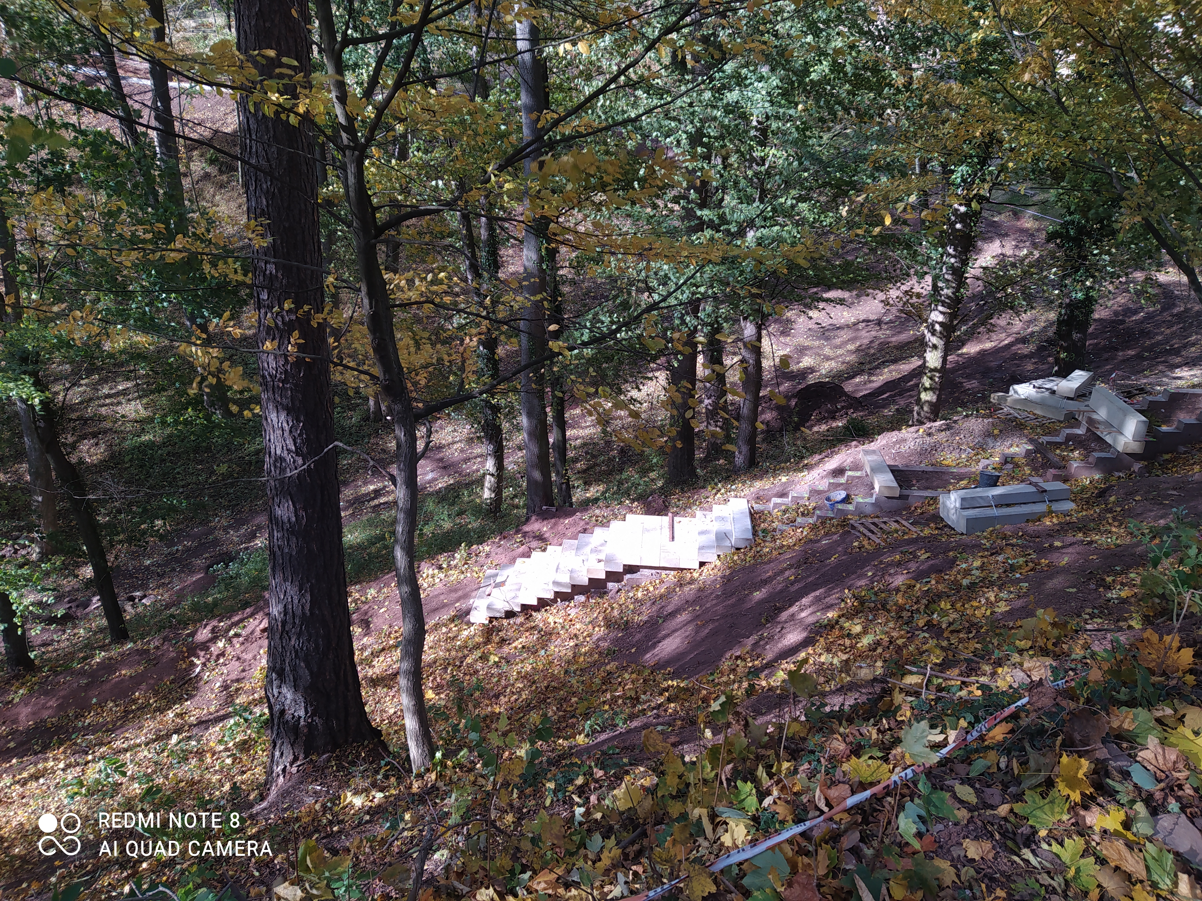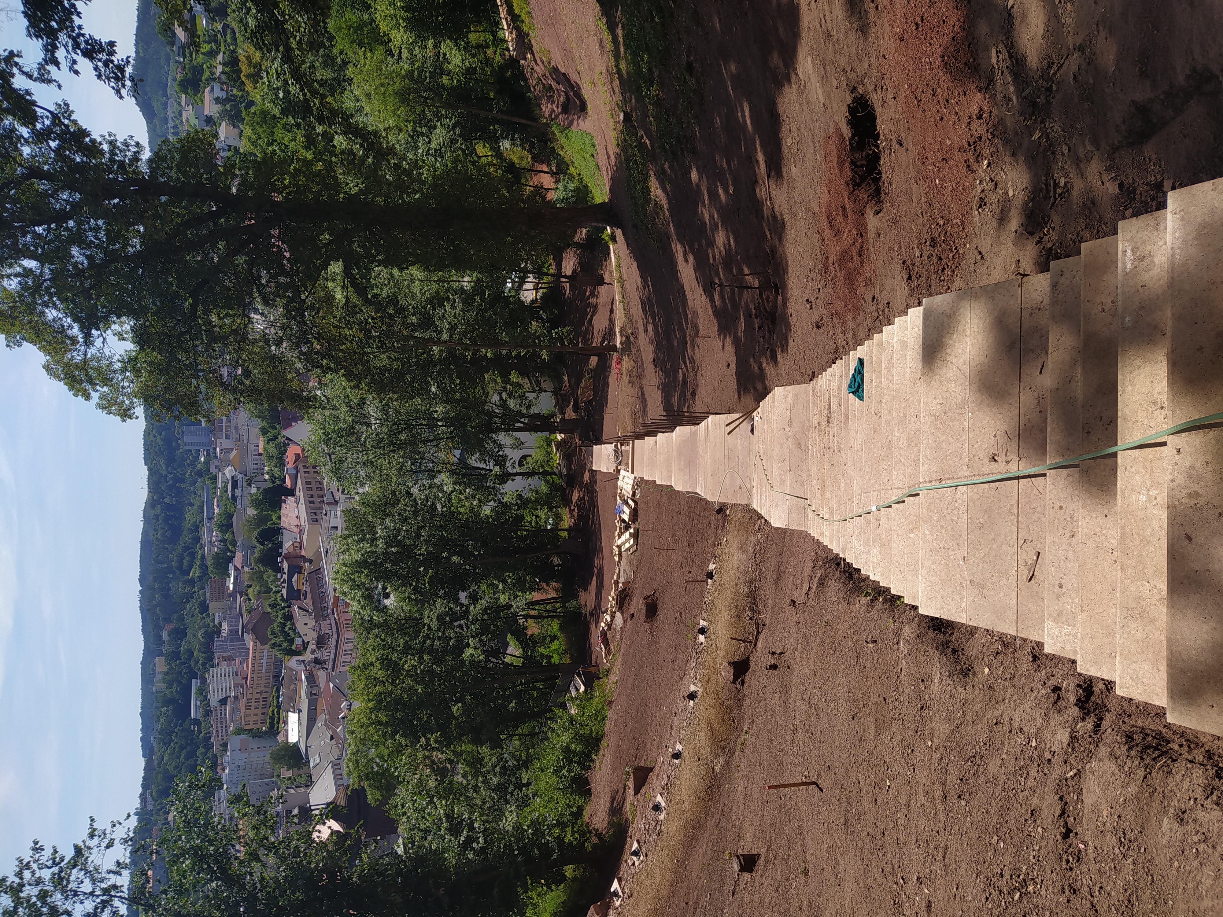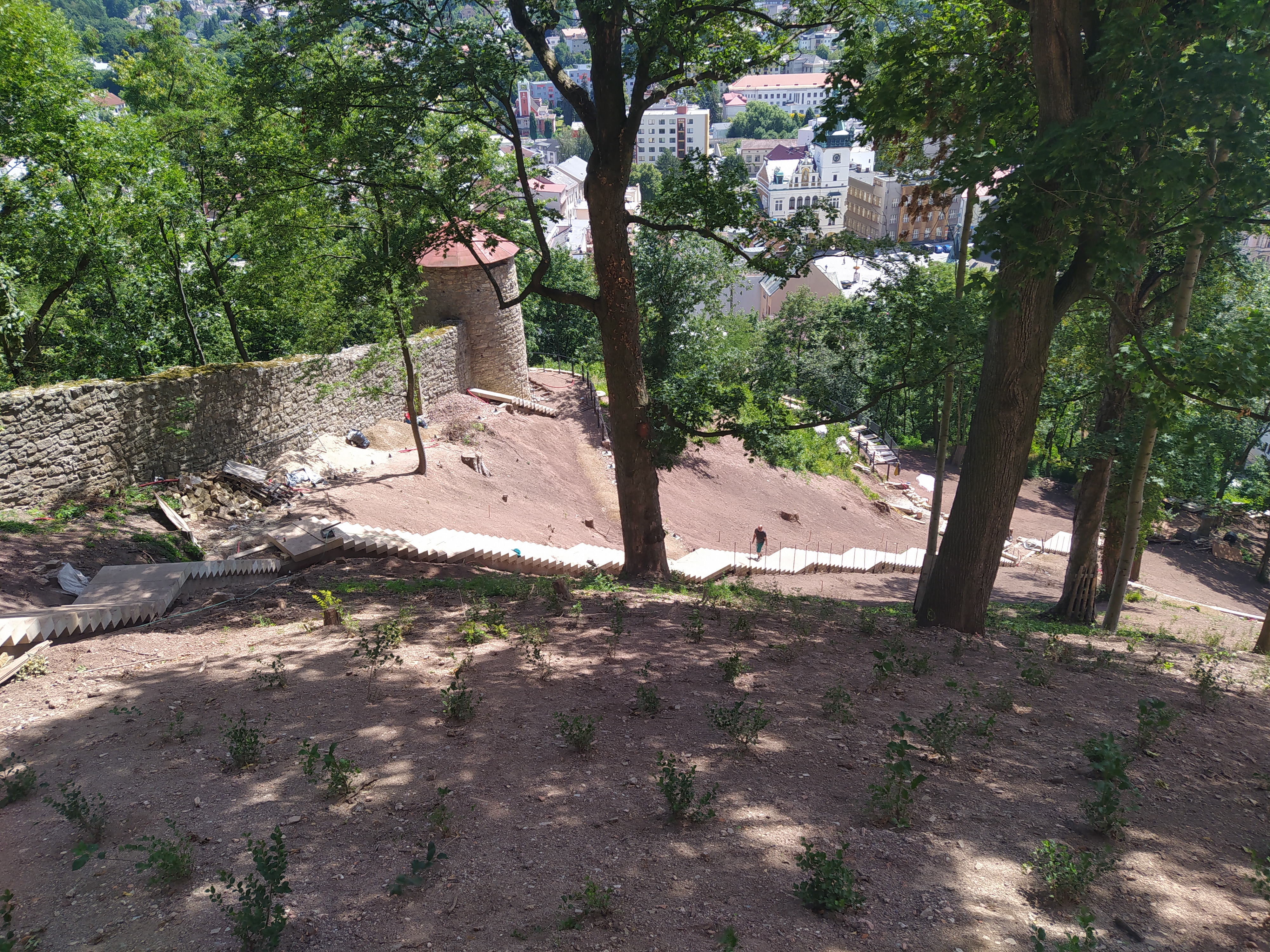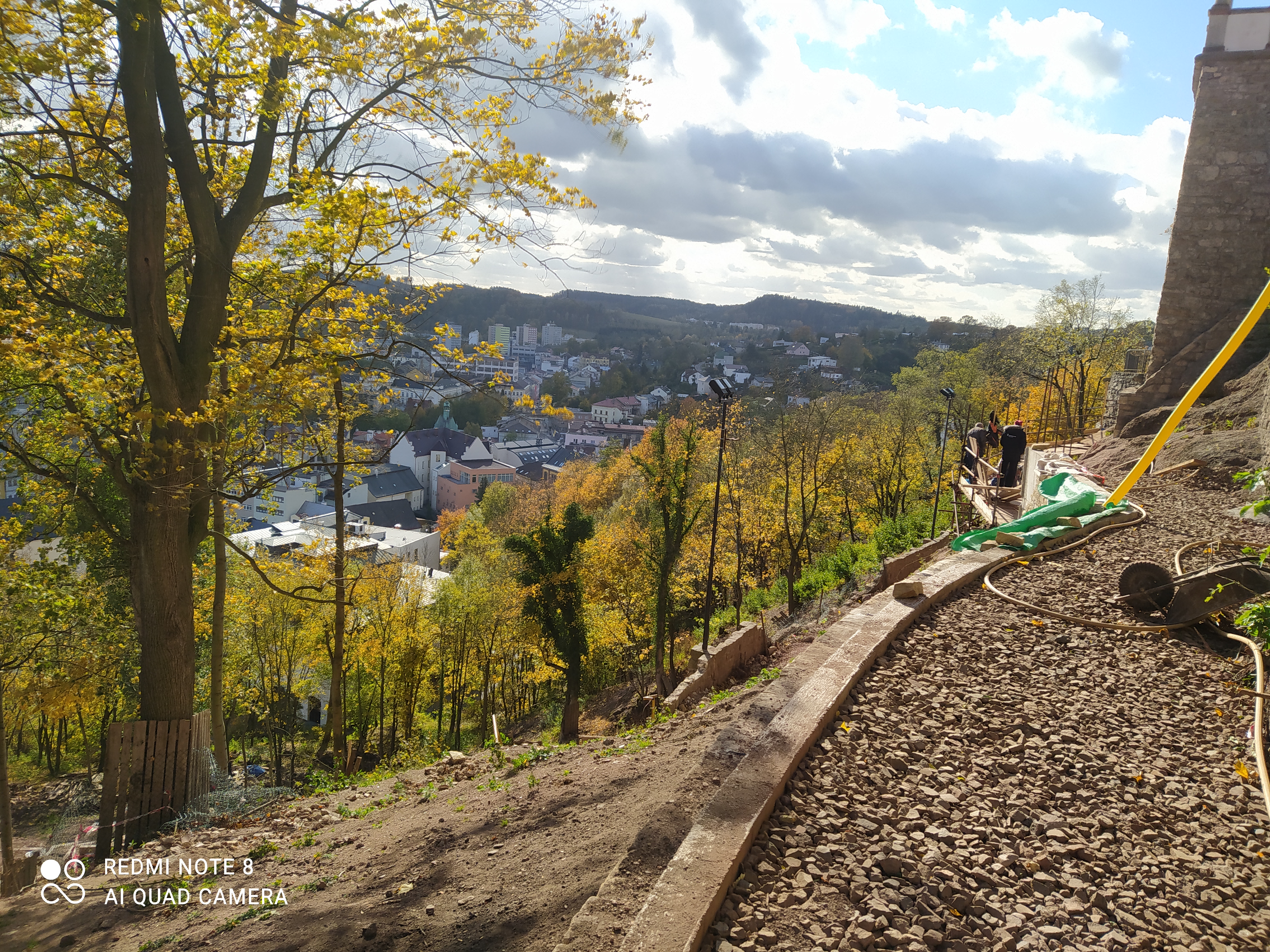 Probíhá montáž nových kamenných schodišťových stupňů na schodištích od Hotelu U Beránka a pod západními terasami, zemních svítidel na nové okružní cestě a stejně tak zámečnických konstrukcí zábradlí a ocelových schodišť.