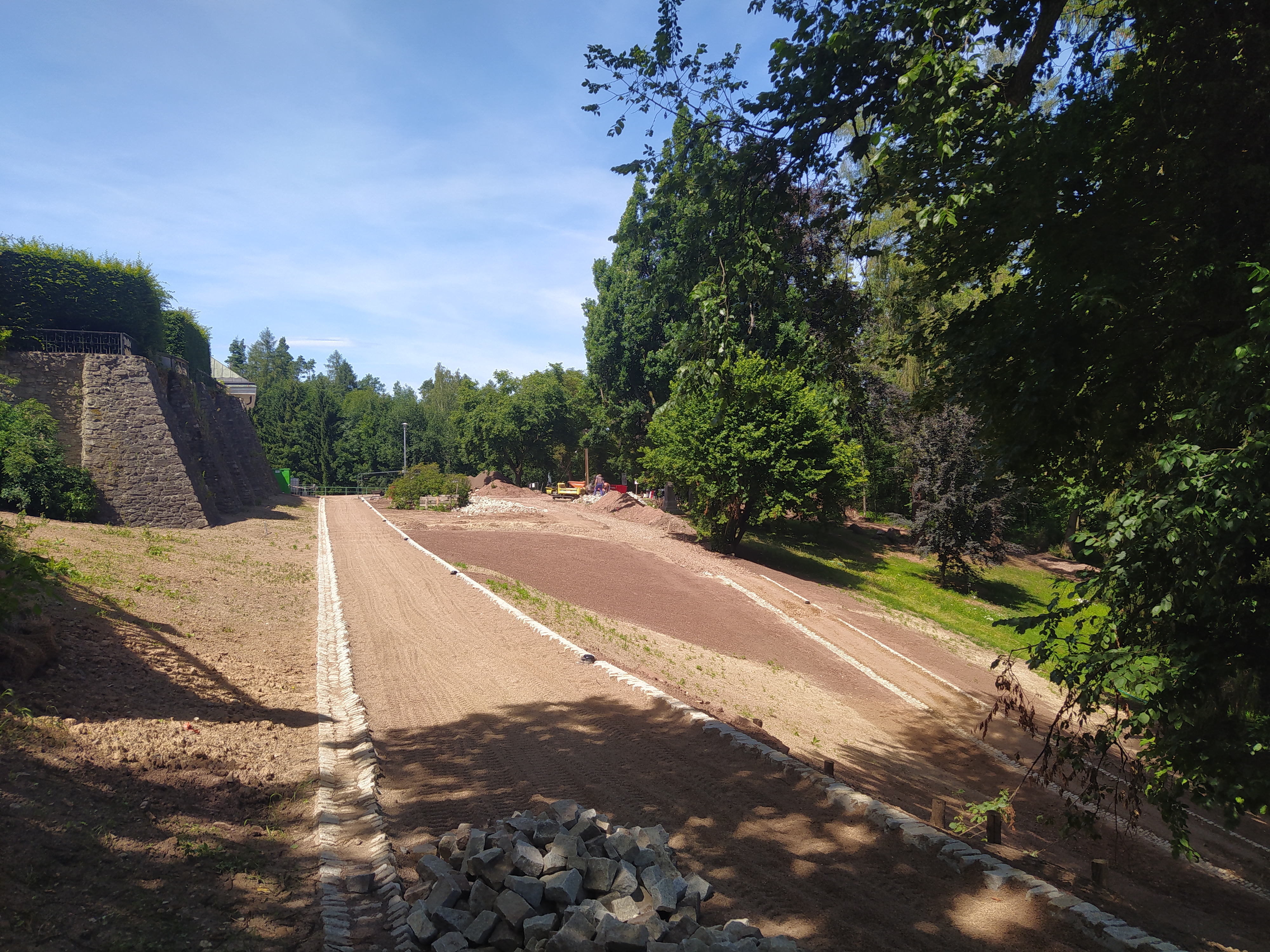 Probíhá další modulace terénu v západní části areálu včetně realizace povrchů budoucích mlatových cest. A postupně budou dokončovány také zemní práce na modulaci svahů a ostatních cest.