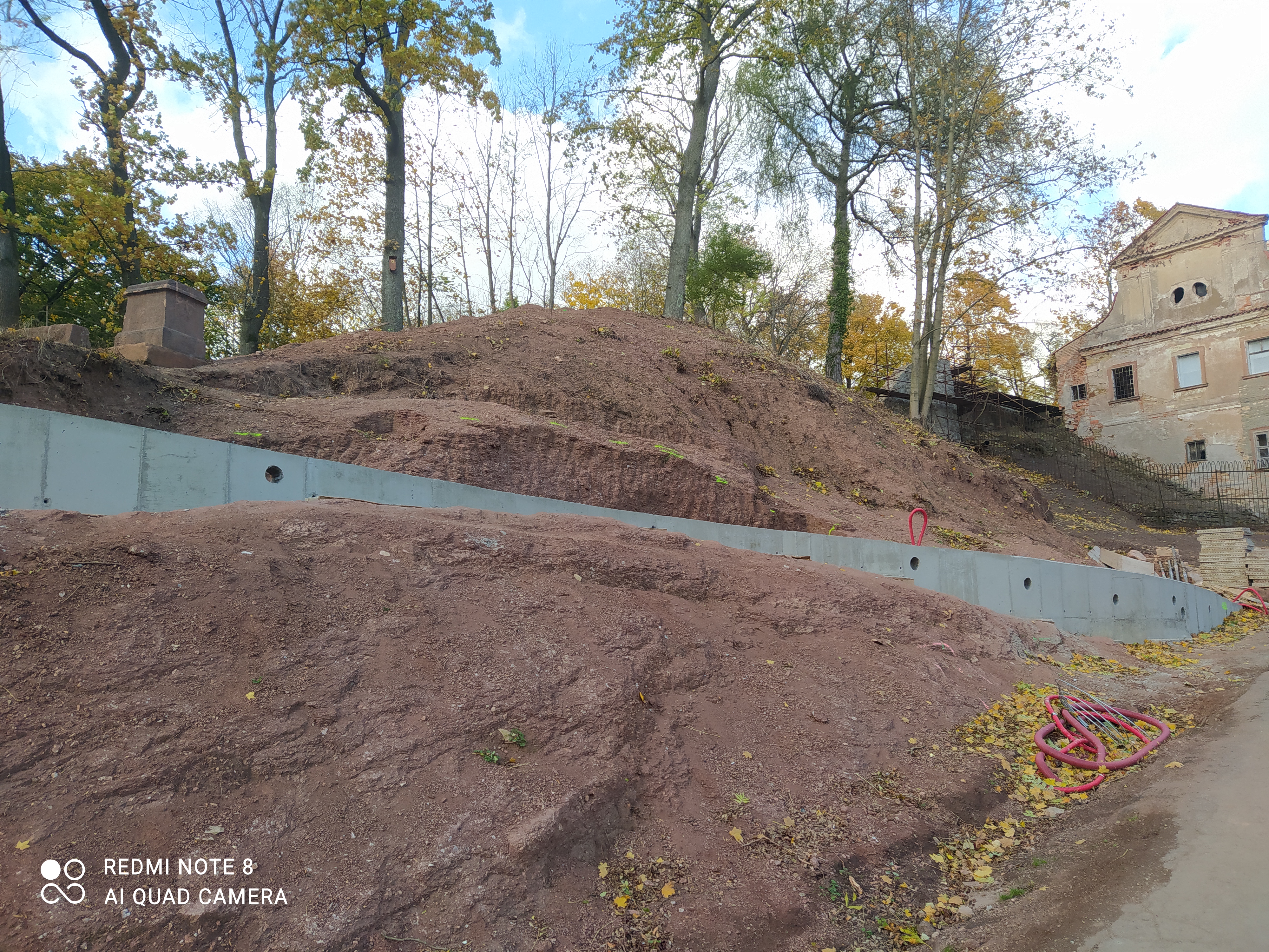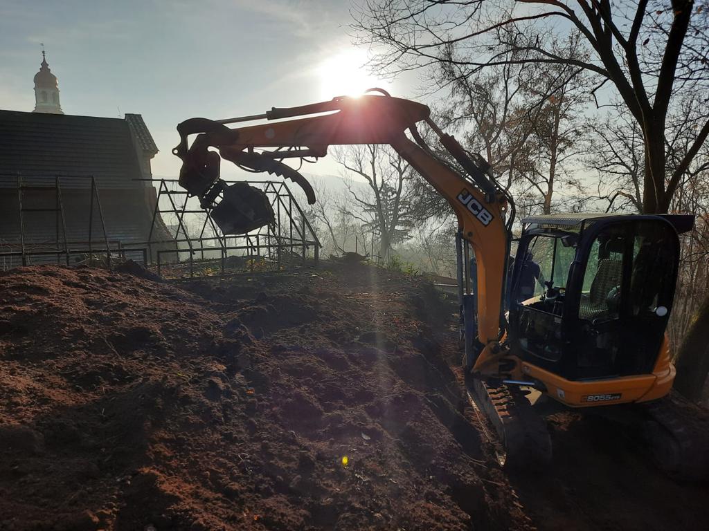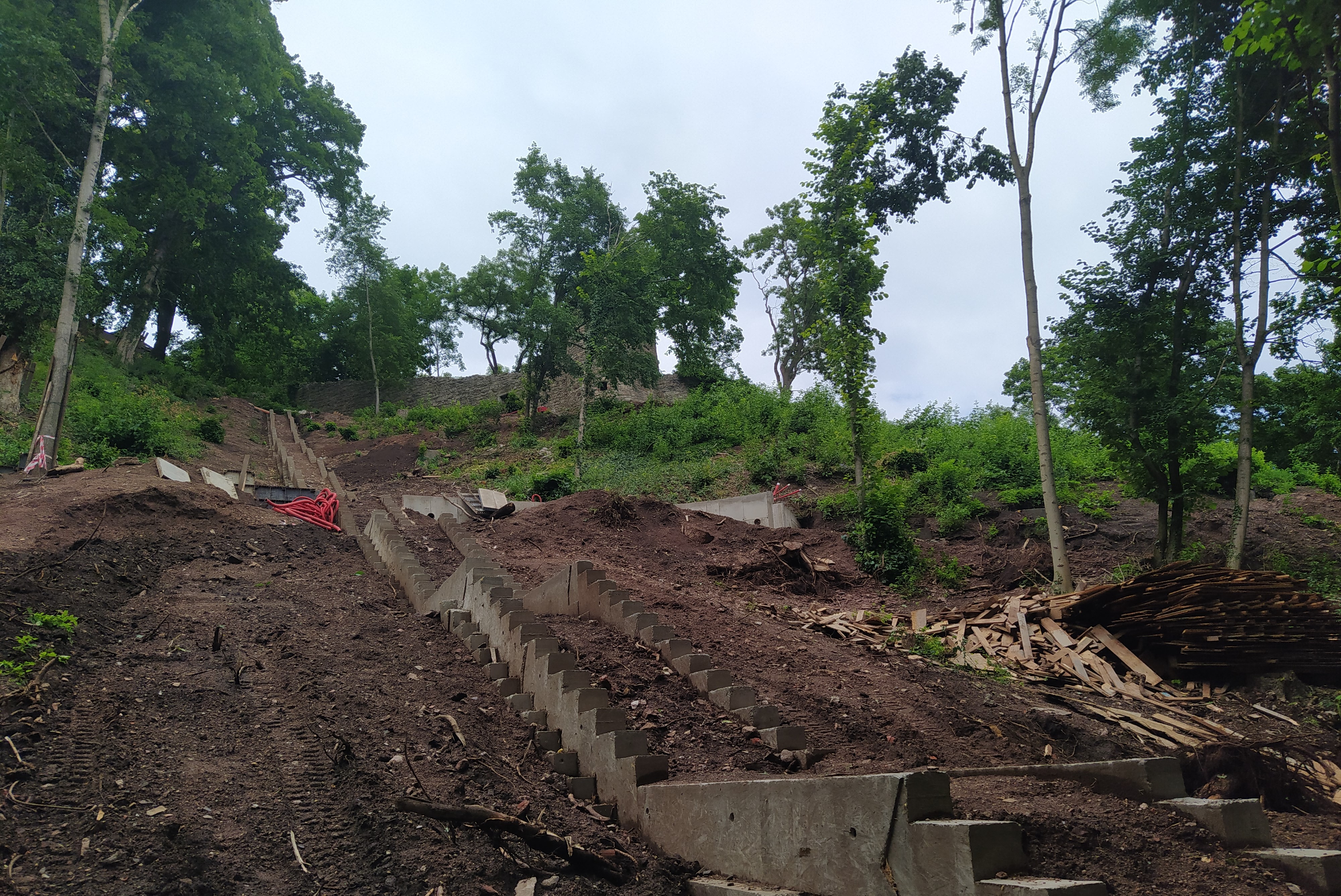Napříč kopcem jsou postupně dokončovány opěrné zdi. Kameníci mohou přistoupit k jejich obložení pískovcem.
