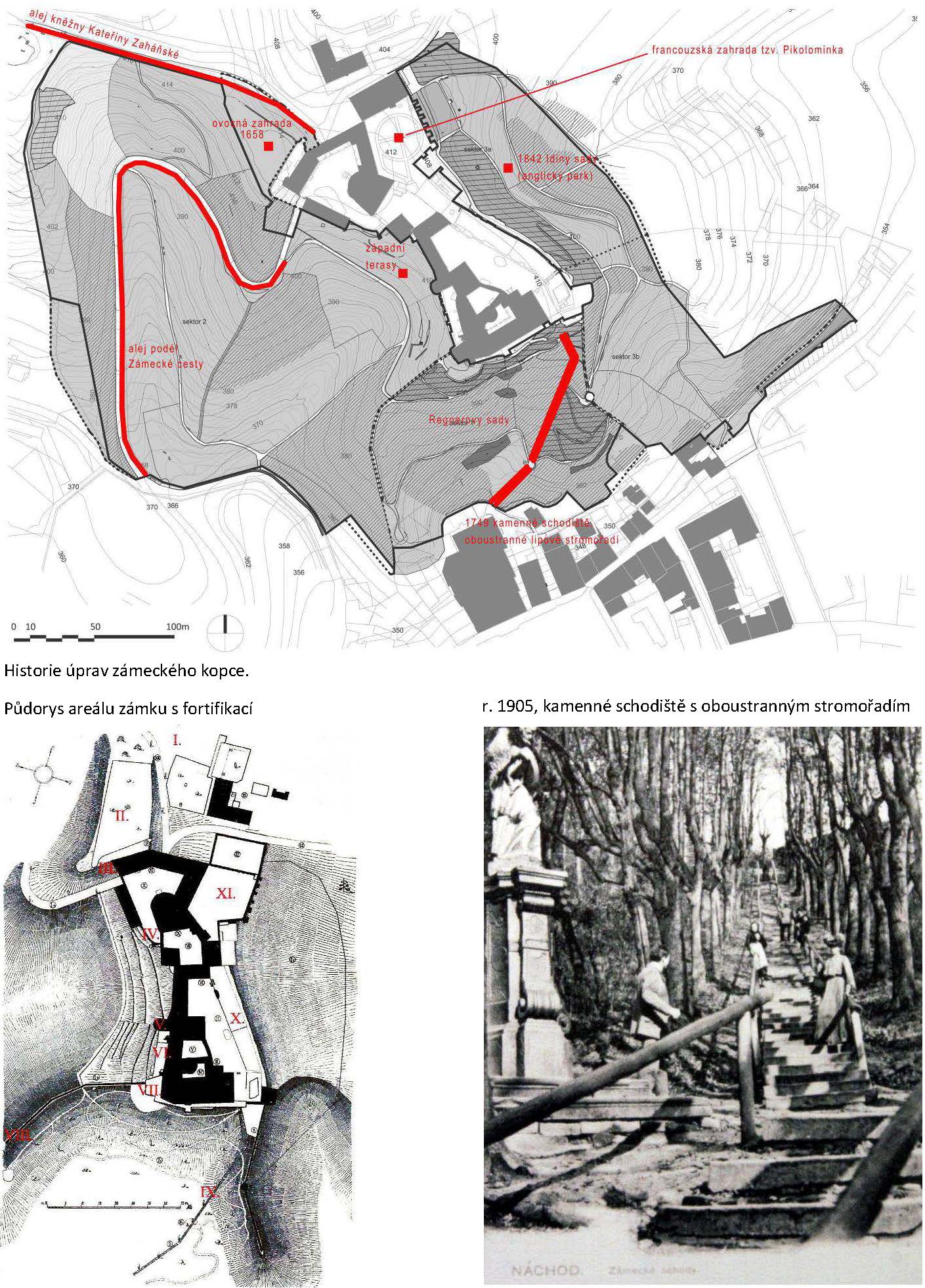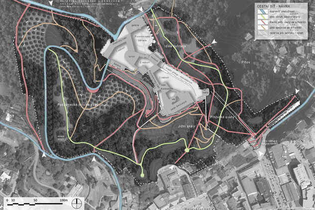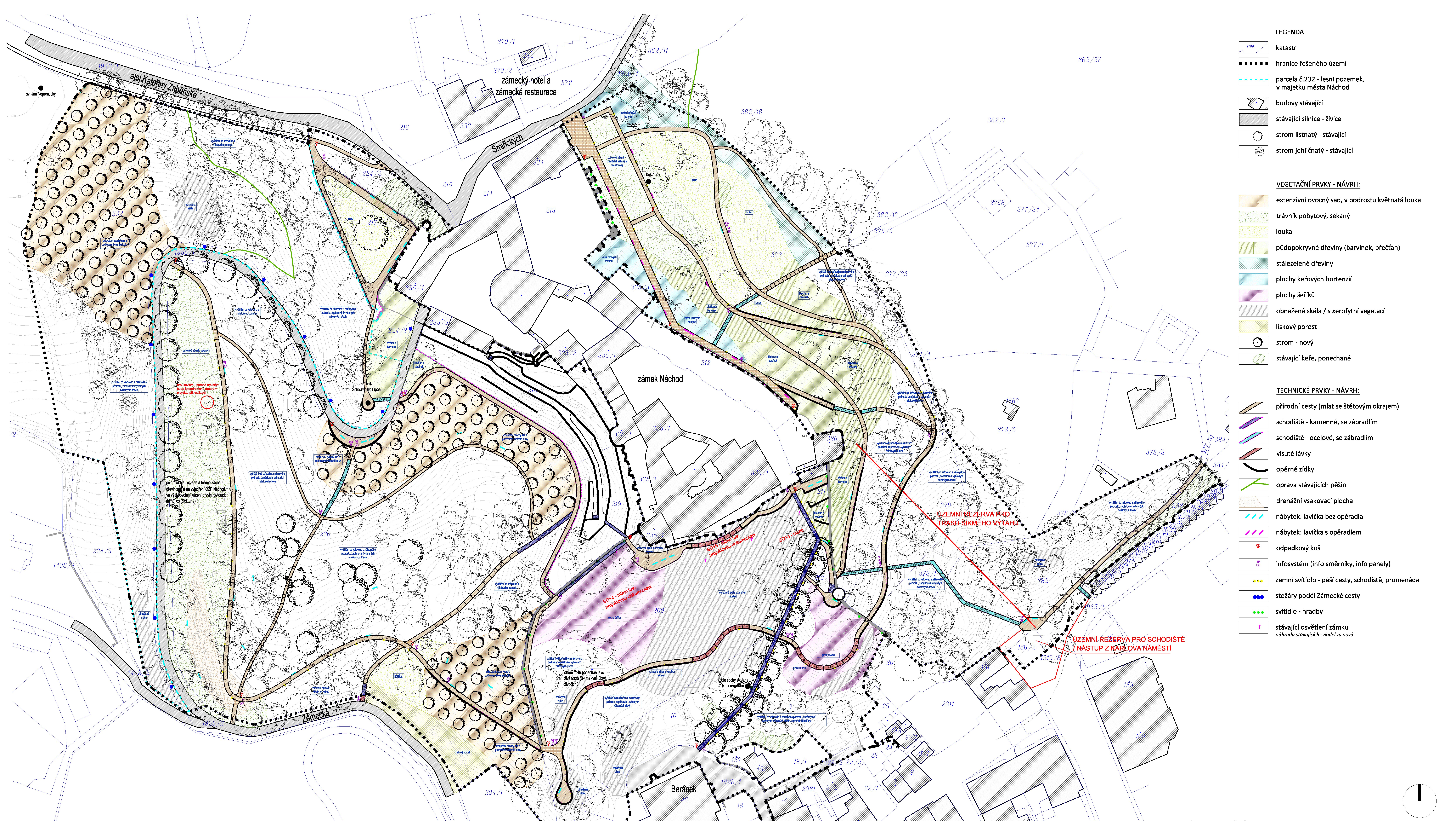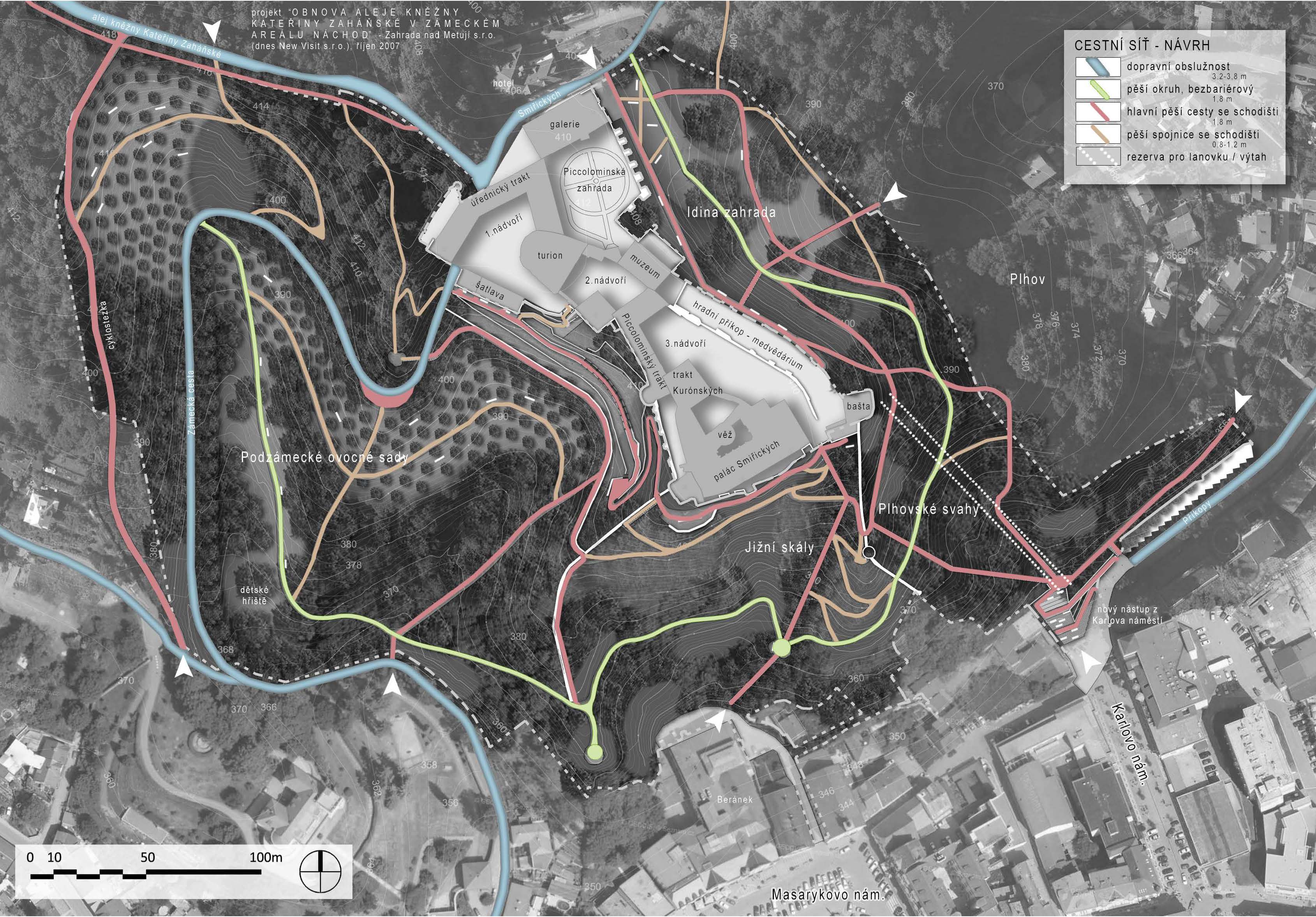 Dochází k modulaci jednotlivých cest napříč zámeckým kopcem, kdy se hledá nejlepší řešení pro budoucí uživatele s ohledem na velmi náročný a svažitý terén. Zároveň jsou vytvářeny další cesty v návaznosti na připravované ocelové lávky, které umožní návštěvníkům a občanům města Náchod prohlédnout si okolí a prostor zámeckého kopce z jiné perspektivy. Cesty umožní plynulejší pohyb po kopci, např. jedna z nich nabídne možnost si podzámčí projít okružní trasou a dostat se tak přes jižní svah z jedné strany zámku na druhou.