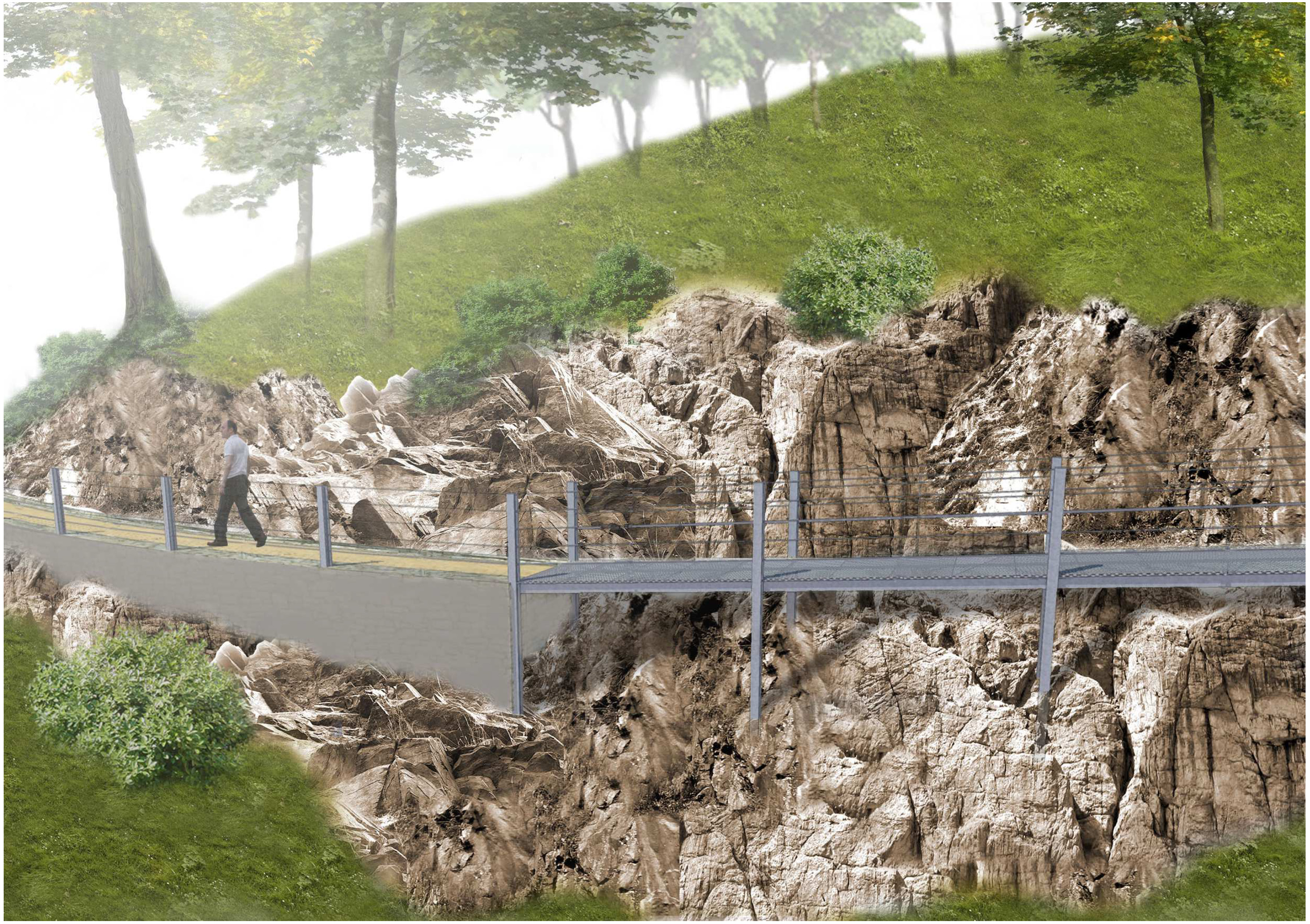 V souvislosti s výše uvedeným proběhly náročné práce v prudkém a skalnatém svahu při zakládání nových opěrných zdí a podpěr pro budoucí ocelové lávky.